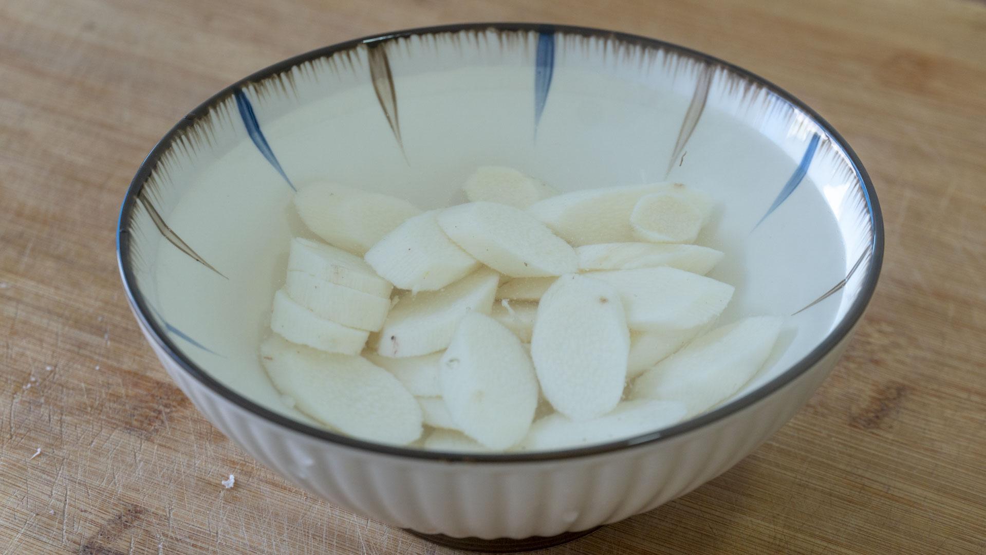 1、山藥一根,去皮後切片,加清水泡着,避免氧化變黑,再來一勺白醋,口感會更清脆。