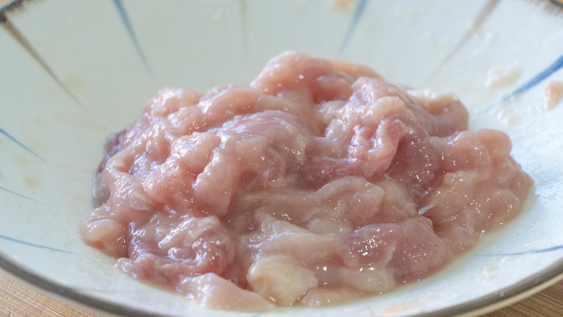 2、紅彩椒準備一個,洗淨後去籽切小塊兒。豬瘦肉一小塊兒,150克左右就夠了,先切成片,裝入碗裏後簡單的醃製一下,鹽、雞精、料酒、小蘇打,抓拌均勻後再加2勺澱粉水,繼續抓拌均勻,讓肉片薄薄的掛上一層漿就行,喫起來更滑更嫩。