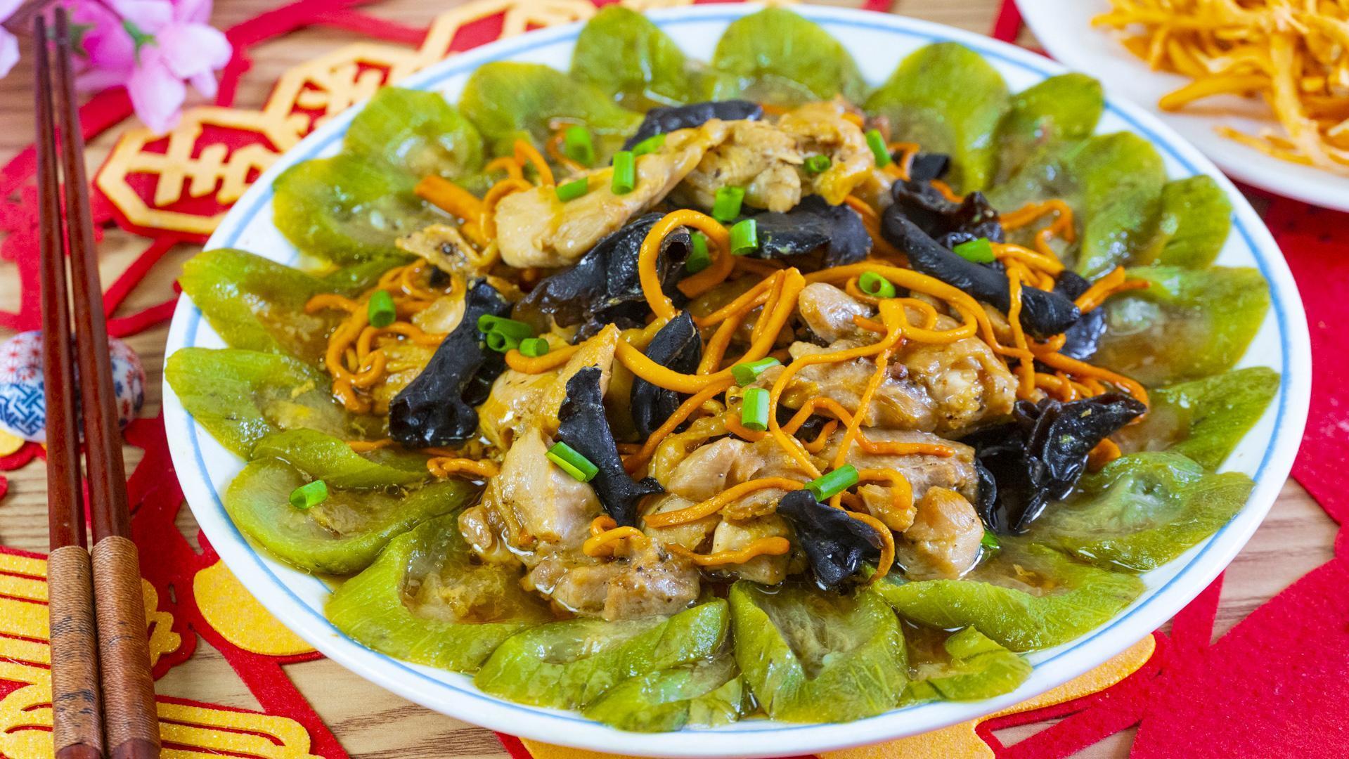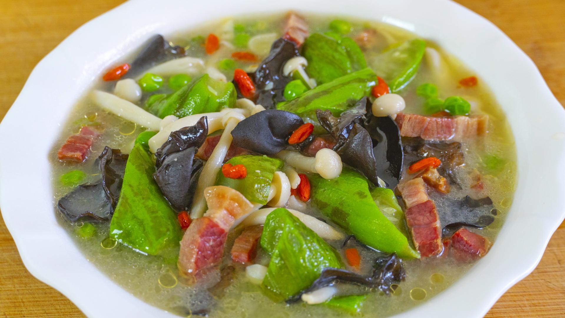 食材:絲瓜1根、白玉菇100克、青豆50克、火腿50克、黑木耳10克