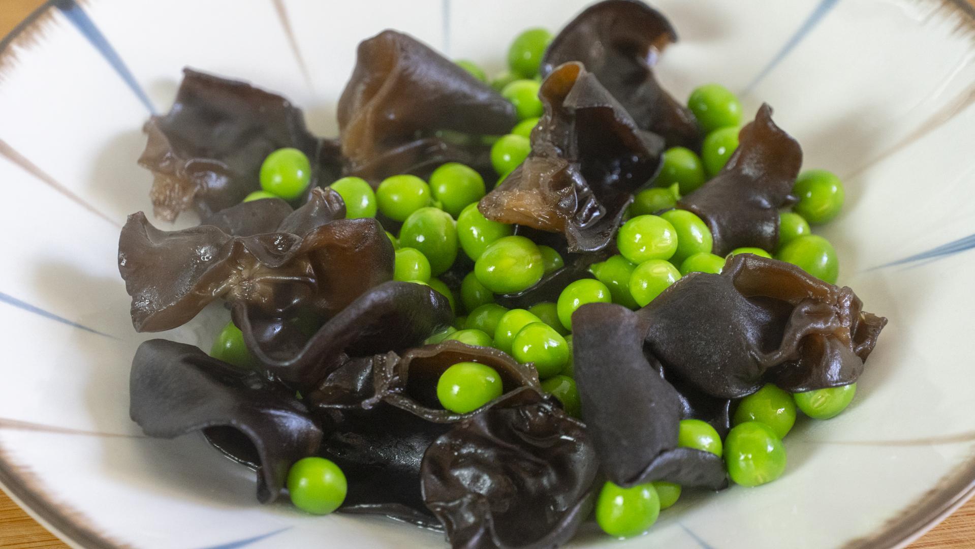 4、起鍋燒水,水開加一勺鹽和一勺食用油,接着依次把青豆、木耳倒進來焯水,大火1分鐘後撈出來晾乾水分備用。