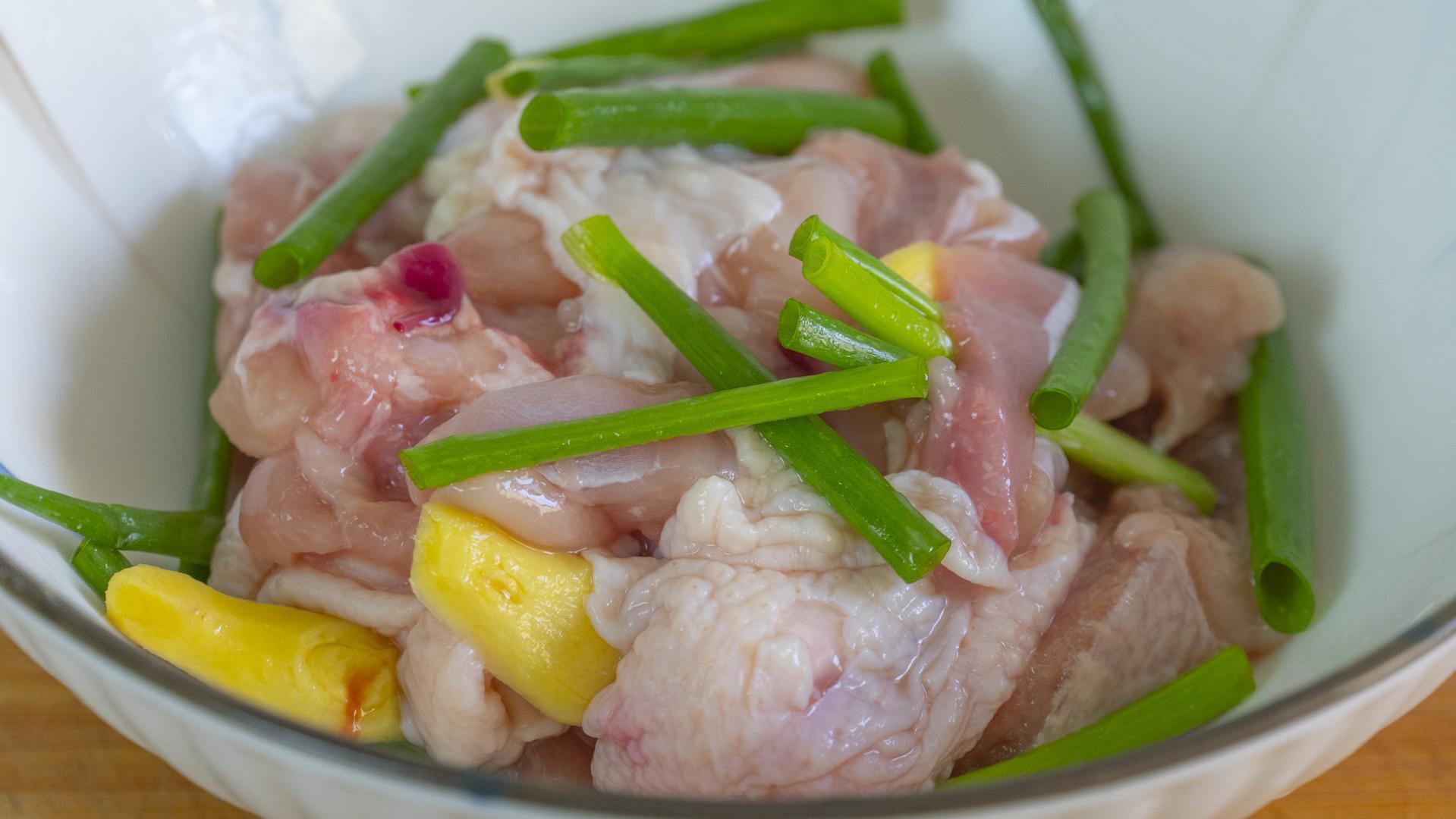 1、雞腿2個,先清洗乾淨,接着來去骨,處理好的雞腿肉切成大塊兒,然後裝入碗裏開始醃製;加蔥段、薑片、料酒去腥,然後再加鹽、生抽、胡椒粉入個底味,最後加一小勺澱粉和一勺花生油抓拌均勻,接着醃製20分鐘。