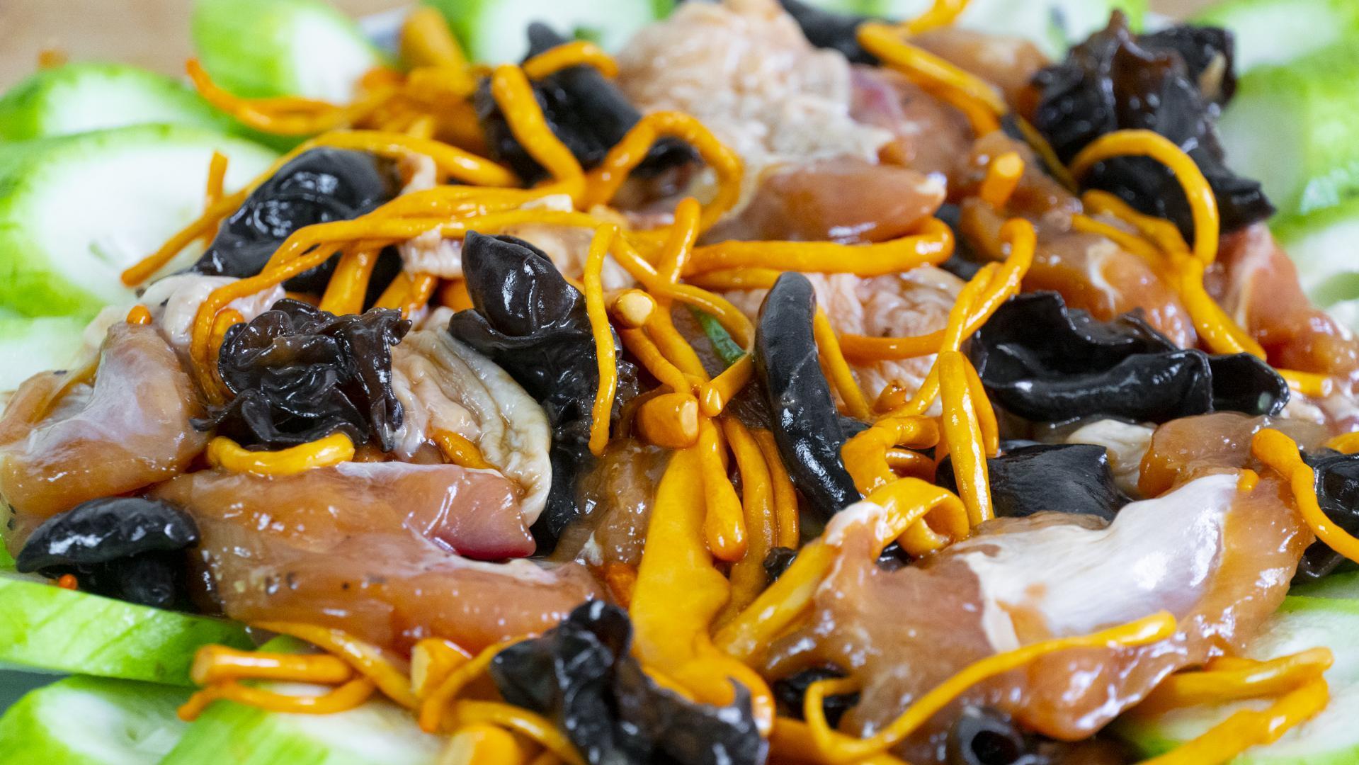 4、蟲草菇1小把,清洗乾淨後瀝乾水分,晾乾水分的蟲草菇直接倒入雞肉裏面,再把泡好的木耳也倒進來,抓拌均勻後放一旁備用。