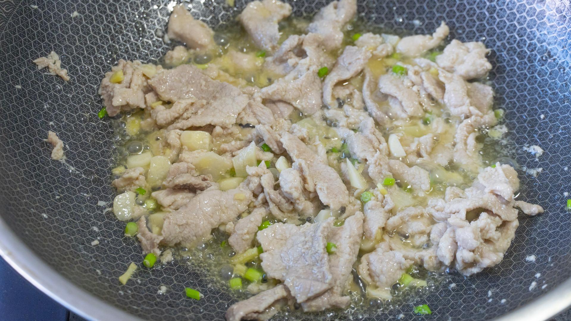 5、接着來炒菜,先倒油潤鍋,鍋燒熱後倒出鍋裏的油,再加涼油後倒入肉片,熱鍋涼油下肉片炒,變色後加蔥薑蒜爆香,出香味兒後加絲瓜和紅椒,絲瓜水分多,要用大火炒。