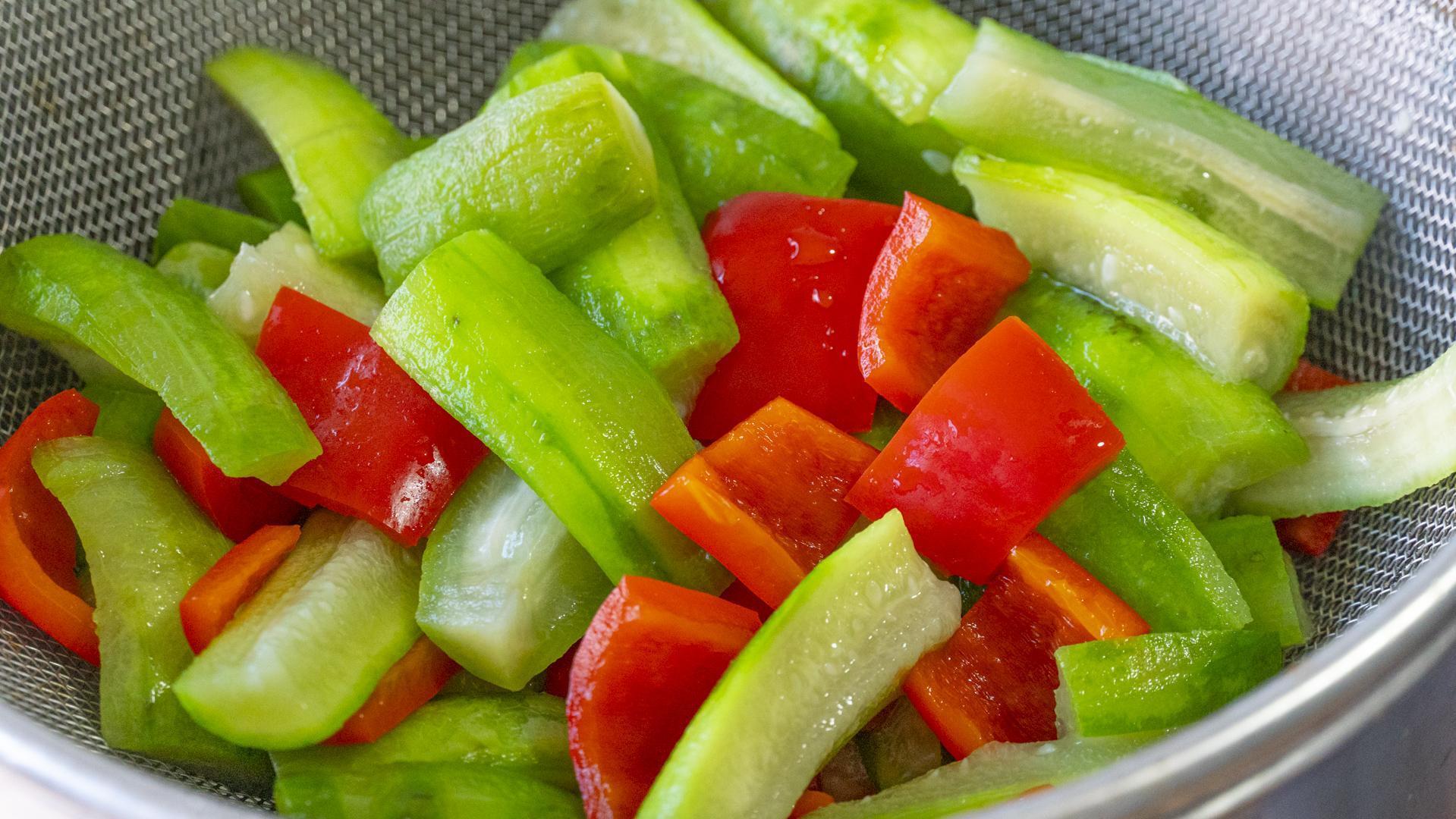 4、絲瓜潮水一分鐘後撈出來,迅速放入涼水中過涼,這時候顏色會更翠綠好看了,倒出來控幹水分備用。