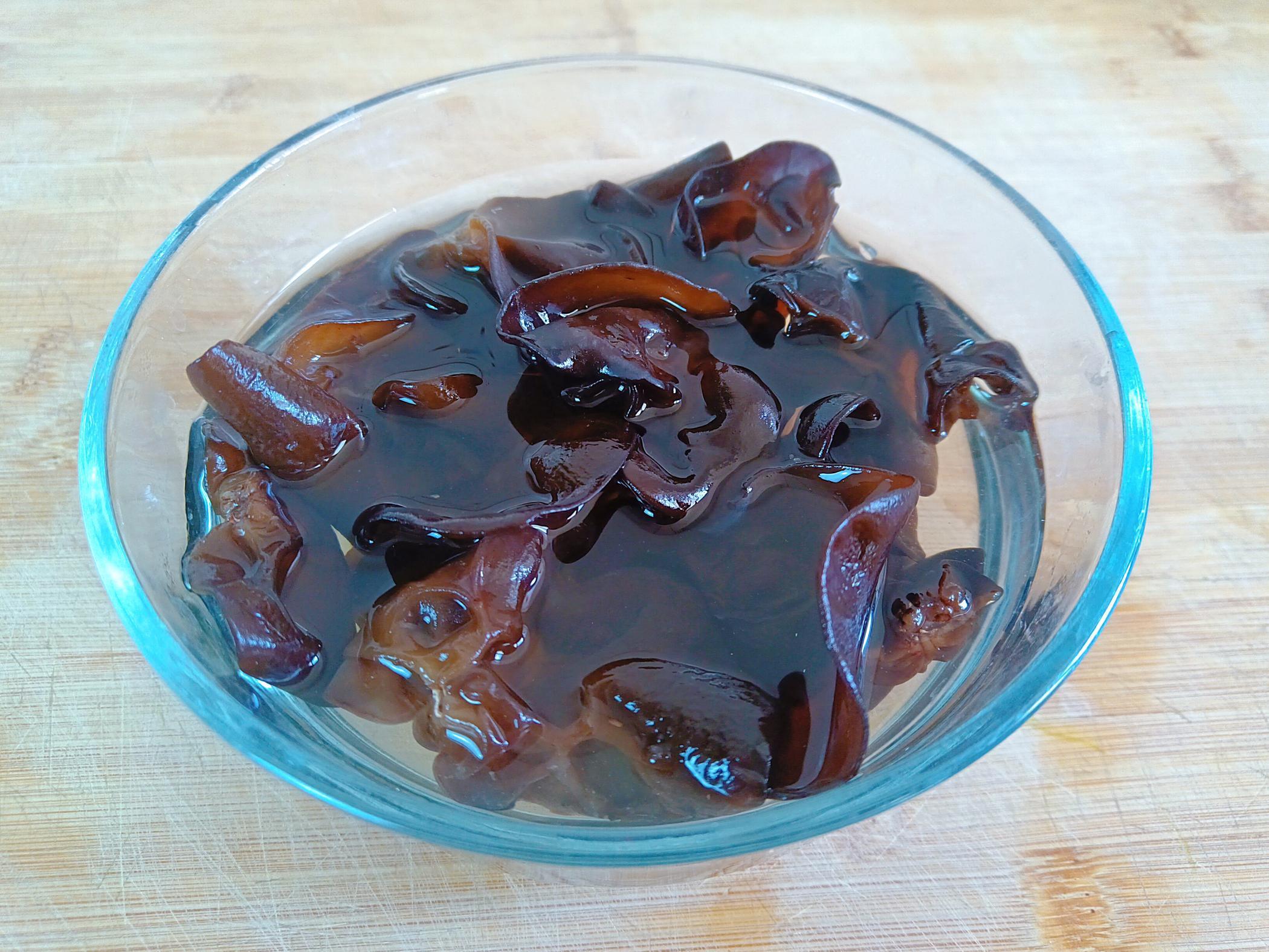 2、黑木耳1把,加一勺鹽和一勺麪粉,然後加溫水泡發10分鐘,讓木耳充分的泡發。