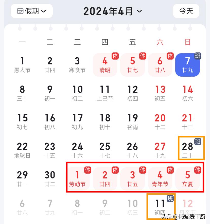 五一假期能實現連休,是用調休換來的。五一前一週的週日(4月28日)要上班,五一後一週的週六(5月11日)要上班,可別忘了訂鬧鐘。對於平時實行單休制,或者假期要值班的人來說,這個上班時間還會有調整,建議大家早做準備,以免耽誤了工作。