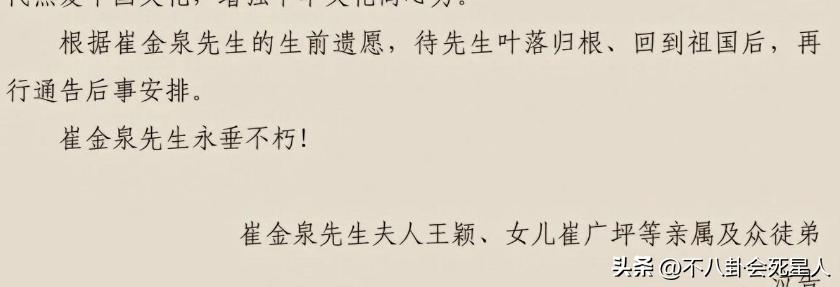 雖然崔金泉定居美國多年,但據他的子女透露,崔金泉臨終的心願還是“落葉歸根”。所以崔金泉的身後事應該也是等他回到國內之後再操辦了。