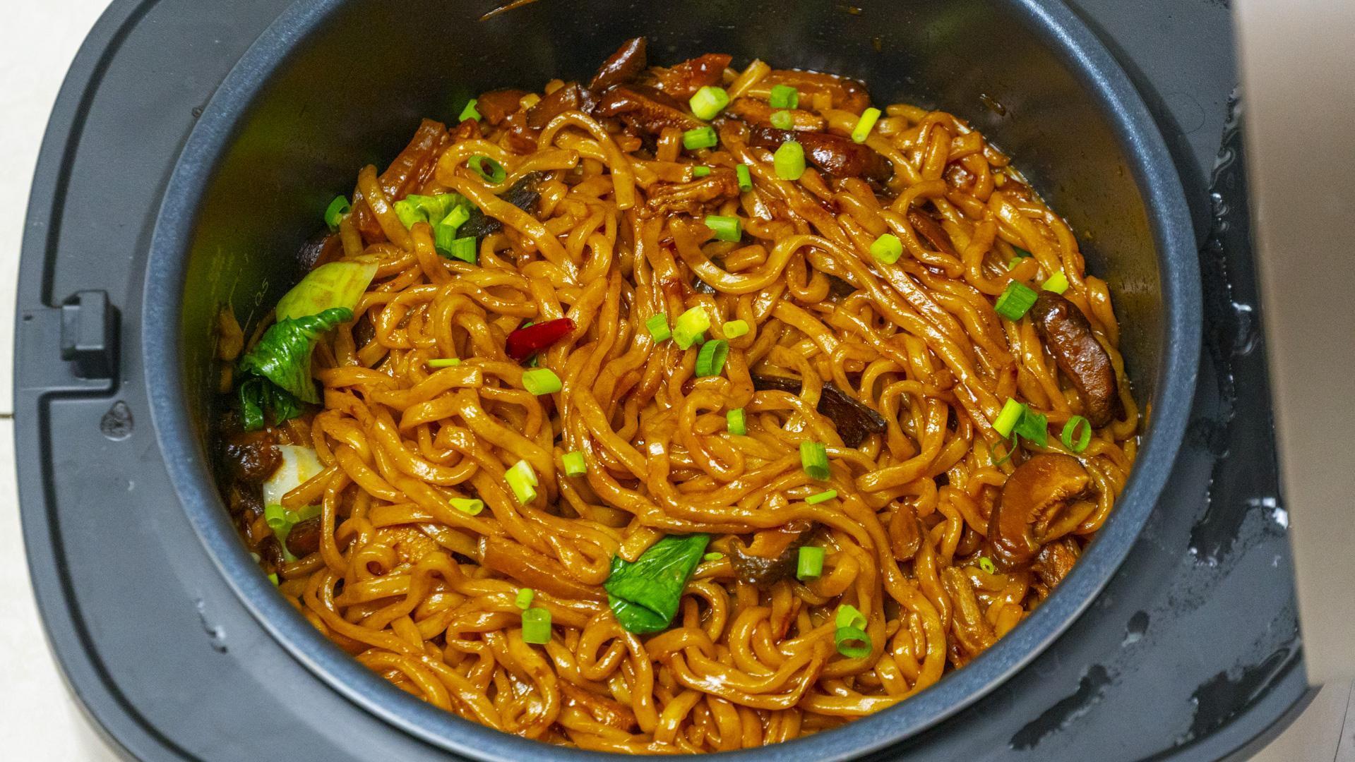 7、電飯煲中的香菇水煮入味後先盛一碗出來,然後再把麪條放進去。