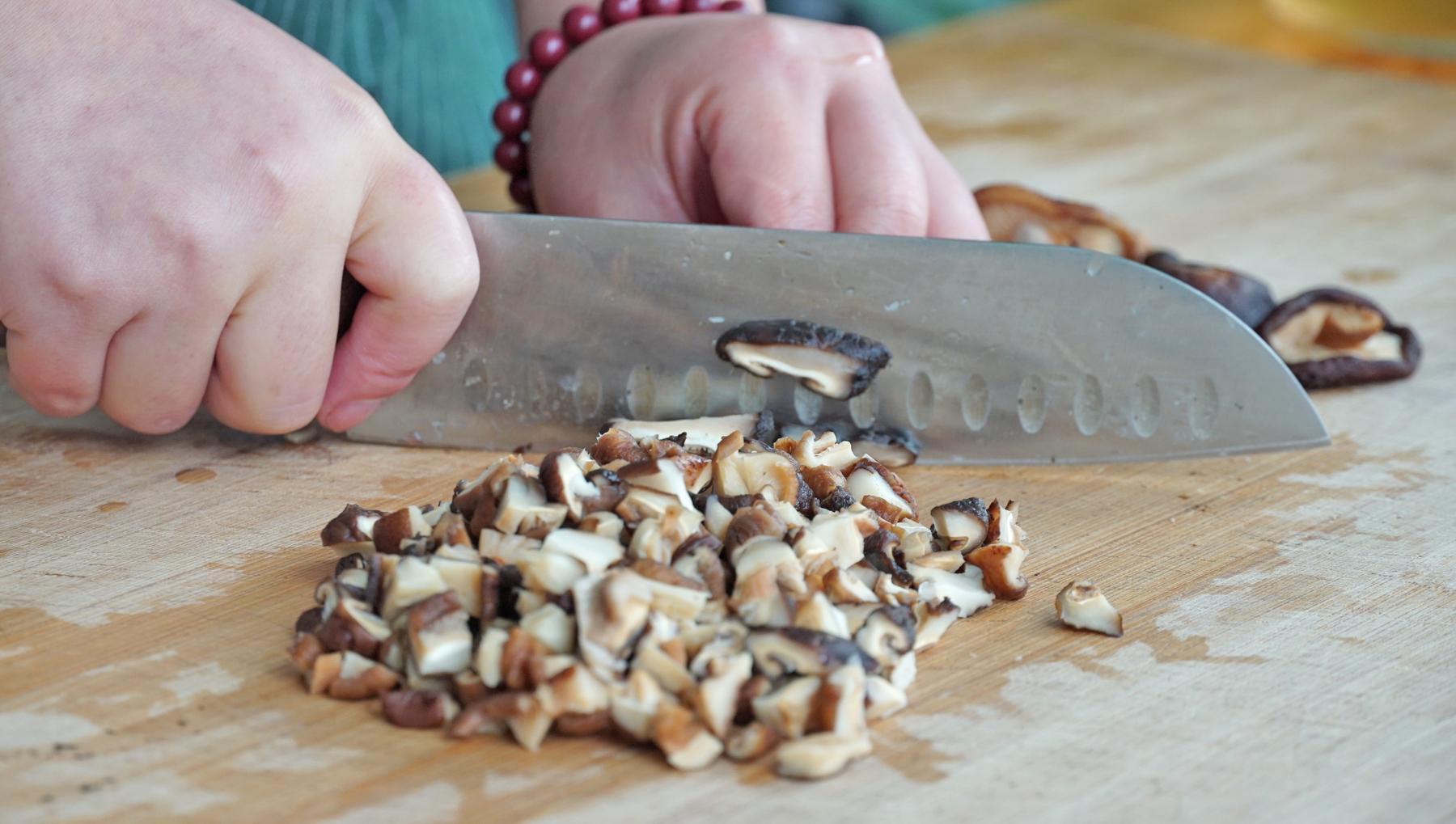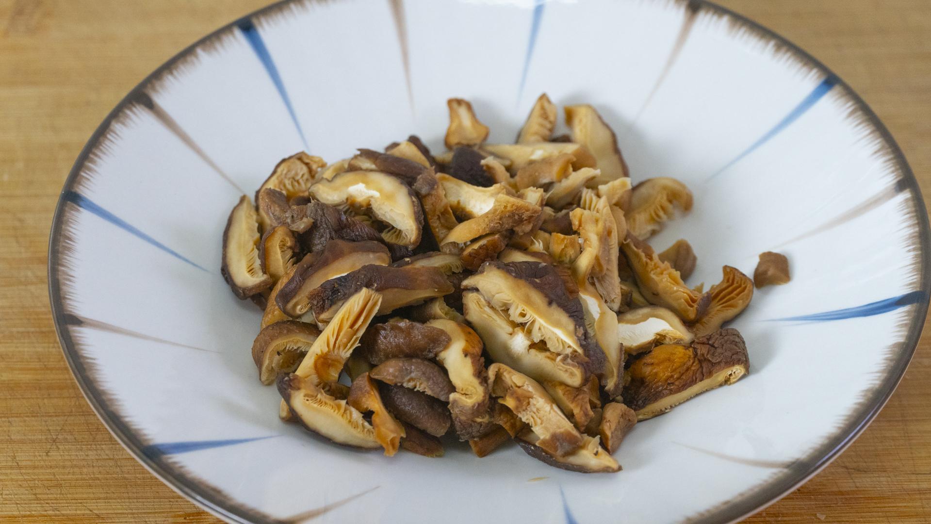 7、香菇也泡好了,擠幹水分改刀切成小丁。
