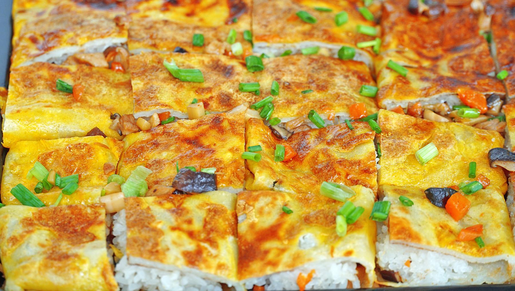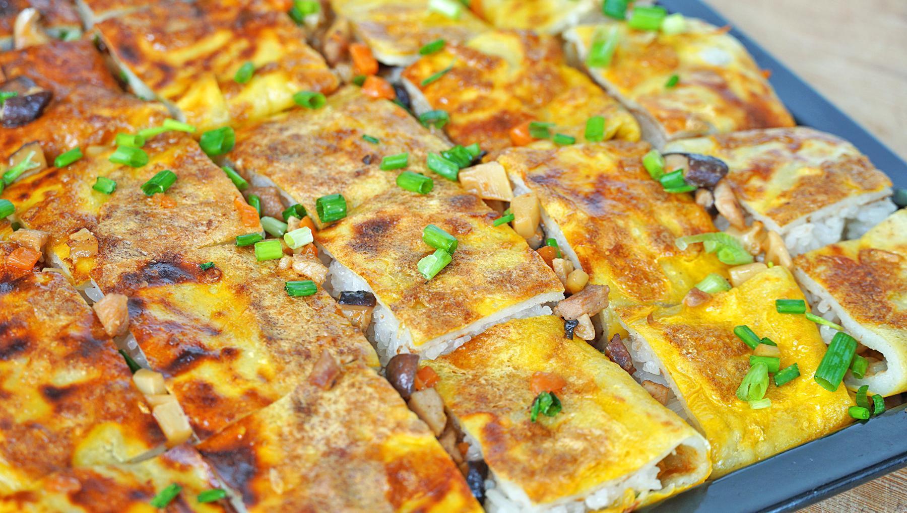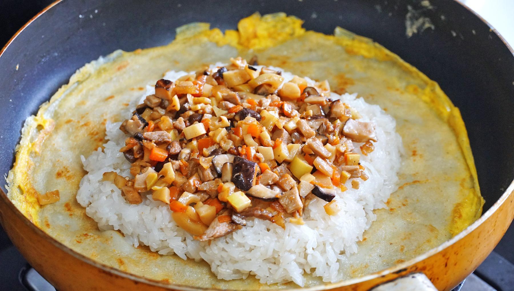 12、然後開小火慢慢煎,蛋液完全凝固就再個面兒,把糯米飯先鋪進來,再舀兩勺煮好的香菇肉丁。
