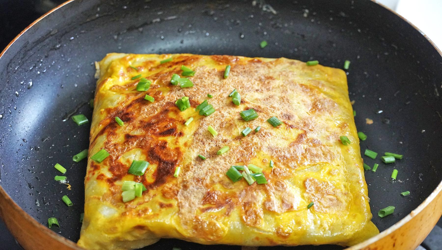 4、凝固了就翻個面兒。繼續煎一會兒。兩面都煎熟了就可以出鍋了,大約10秒出一張雞蛋皮,繼續下一張。