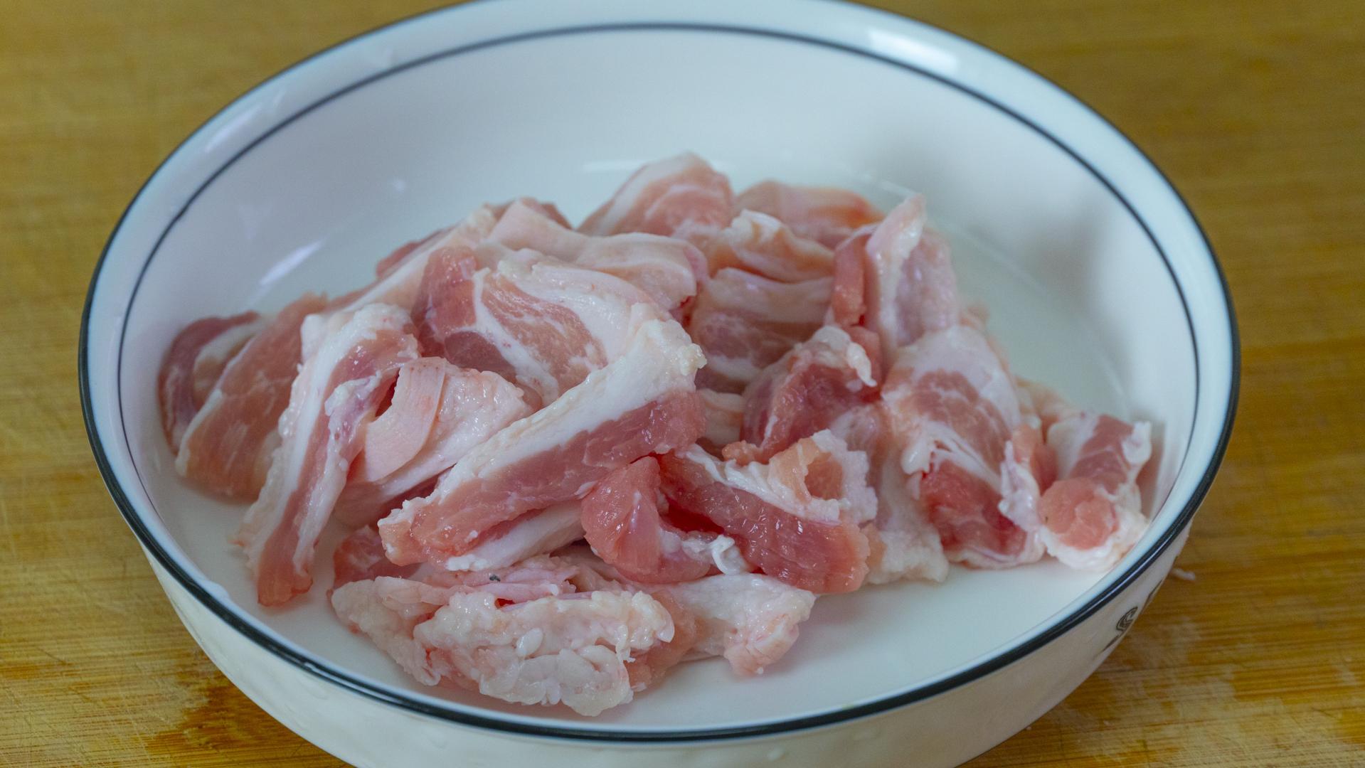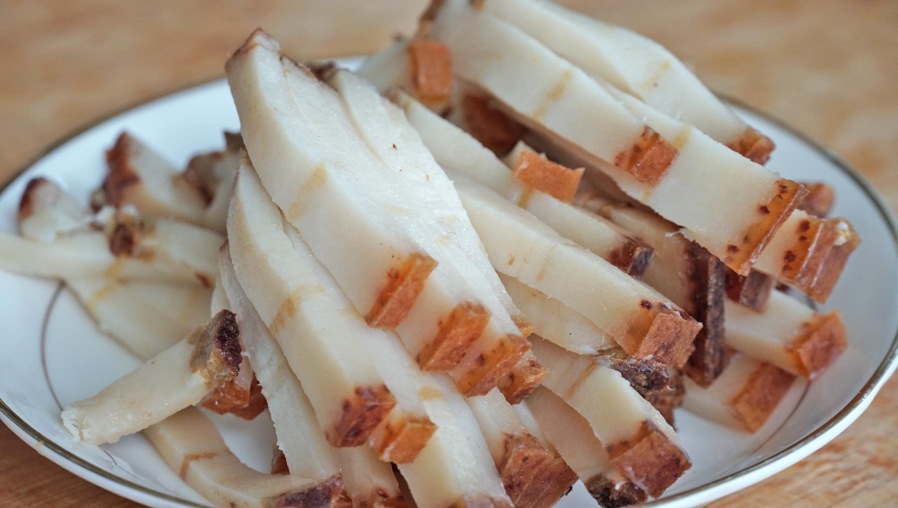 6、這哈來切點臘肉,切成片片後再切成小長條。
