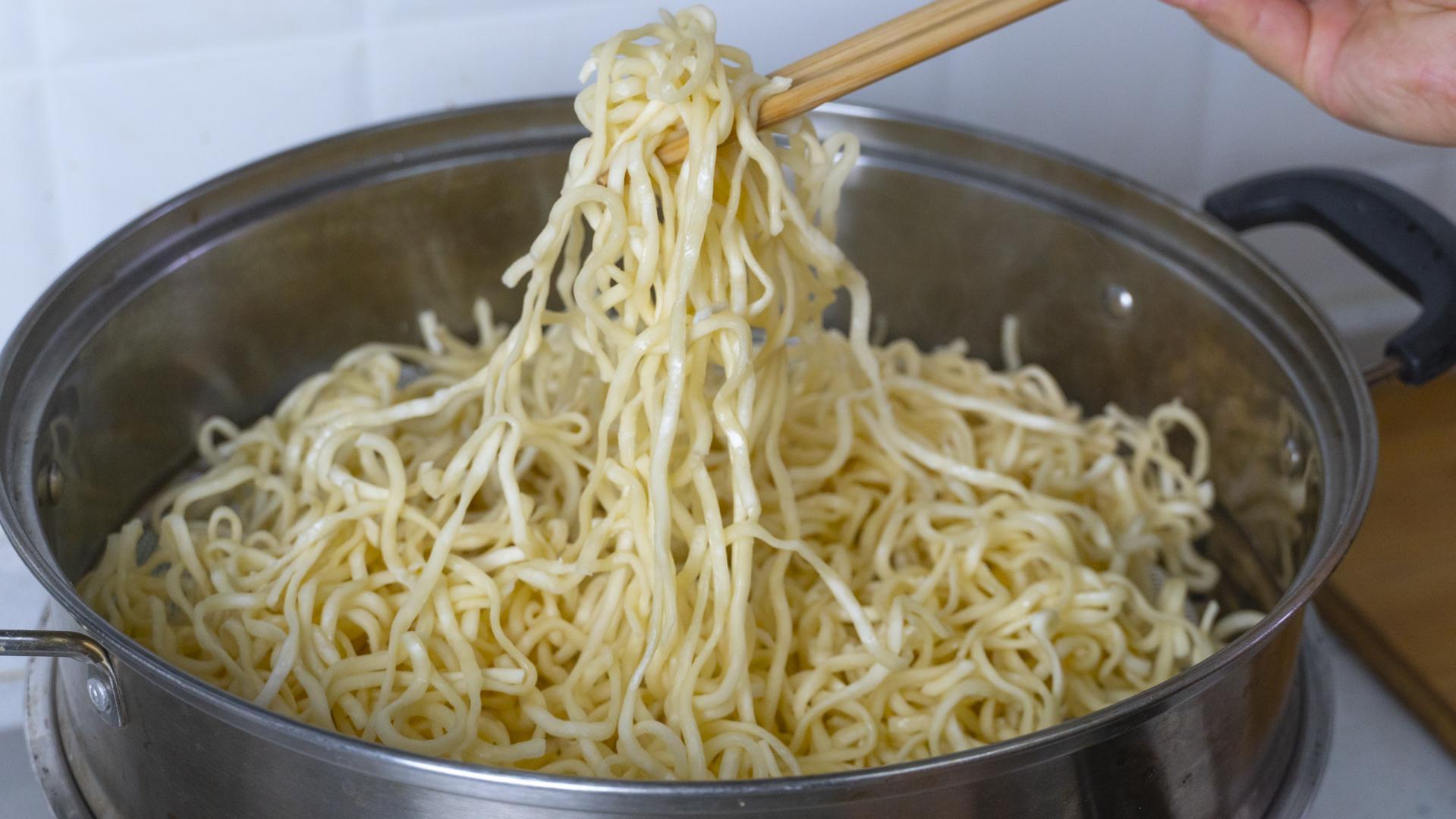 5、煮湯的時候我們來做麪條,新鮮麪條500克,抖散後就可以蒸了。起鍋燒水,水開把麪條放上來蒸,大火蒸6分鐘,關火後把麪條取出來,抖散開,不要讓它都粘連在一起。
