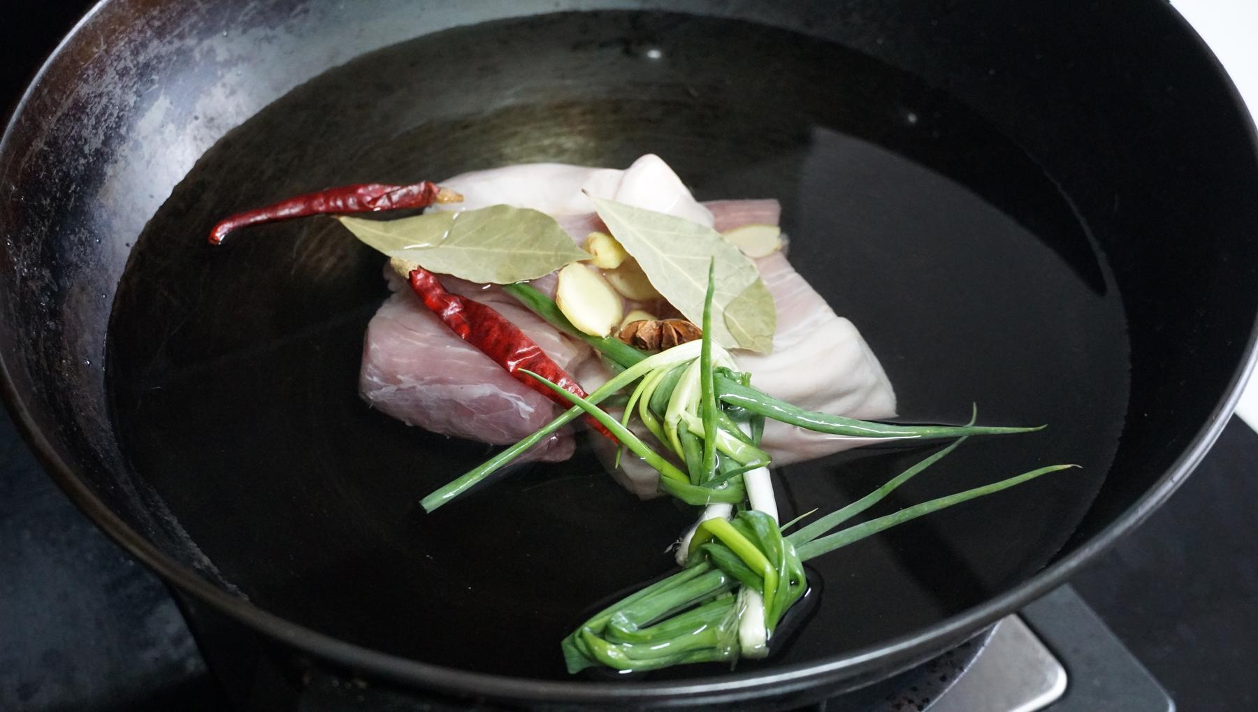 5、豬肉一塊冷水下鍋,加點蔥結、薑片和料酒去腥,再加1個八角、2片香葉、2個幹辣椒增香。