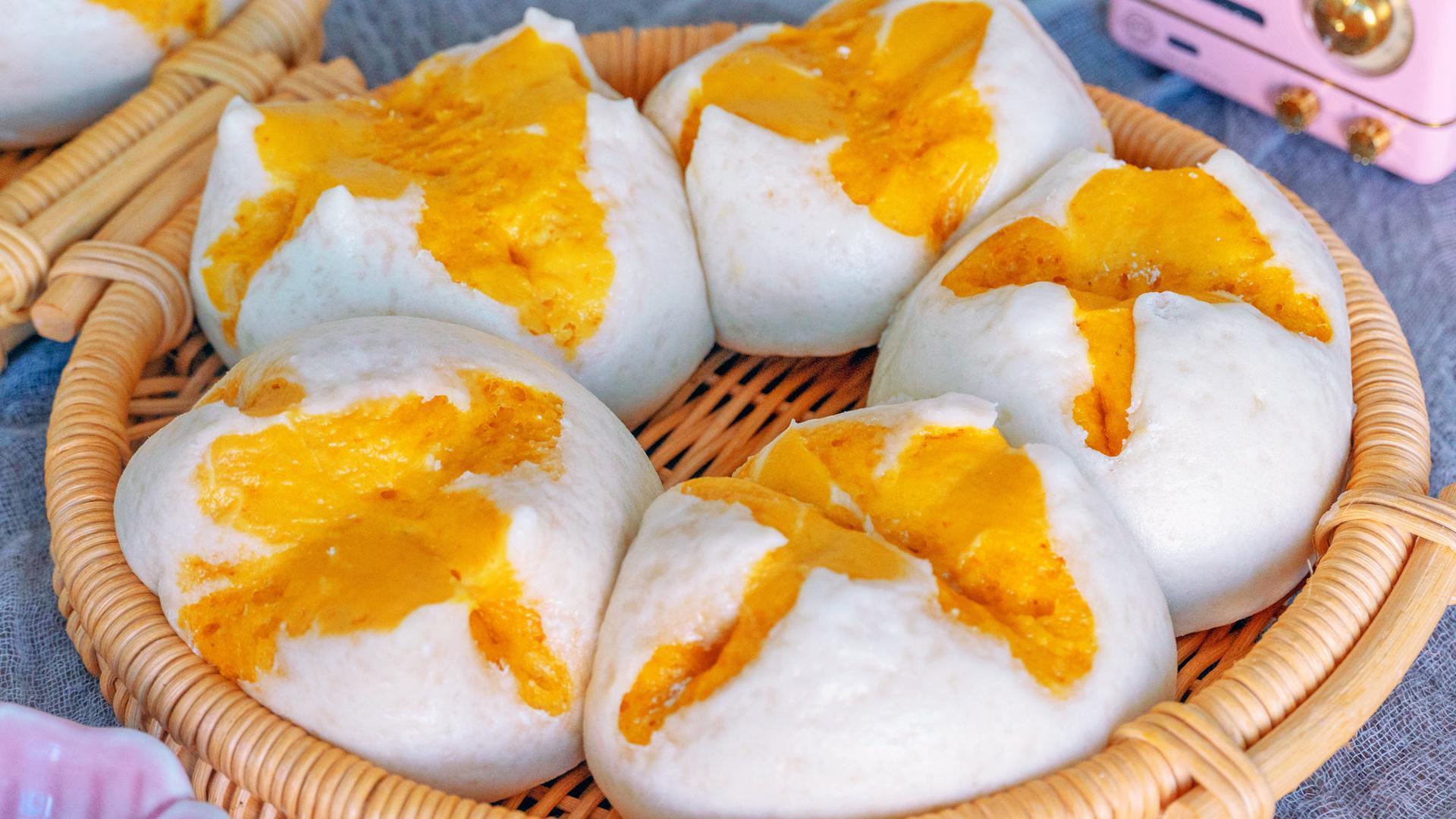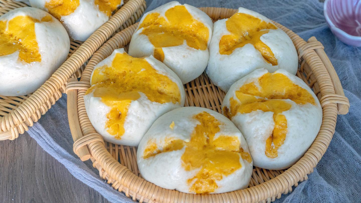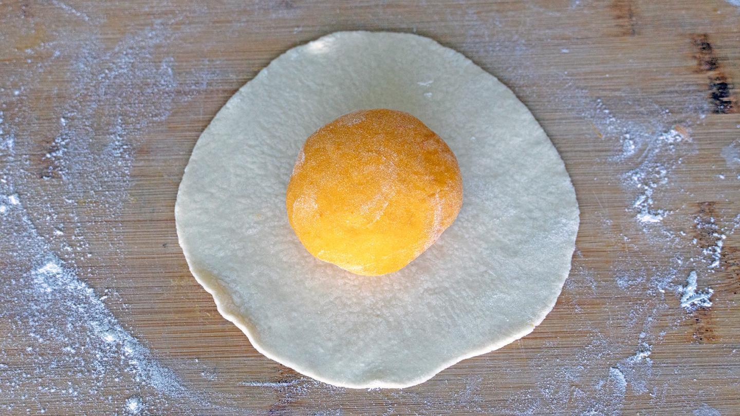 5、分成同樣等分的小面劑子,繼續把每一個小面劑揉光收圓,白色的麪糰擀開擀薄,擀成一張小麪餅。中間放上黃色的麪糰兒,用虎口收攏,整理下,雙重口味的大饅頭就做好了。