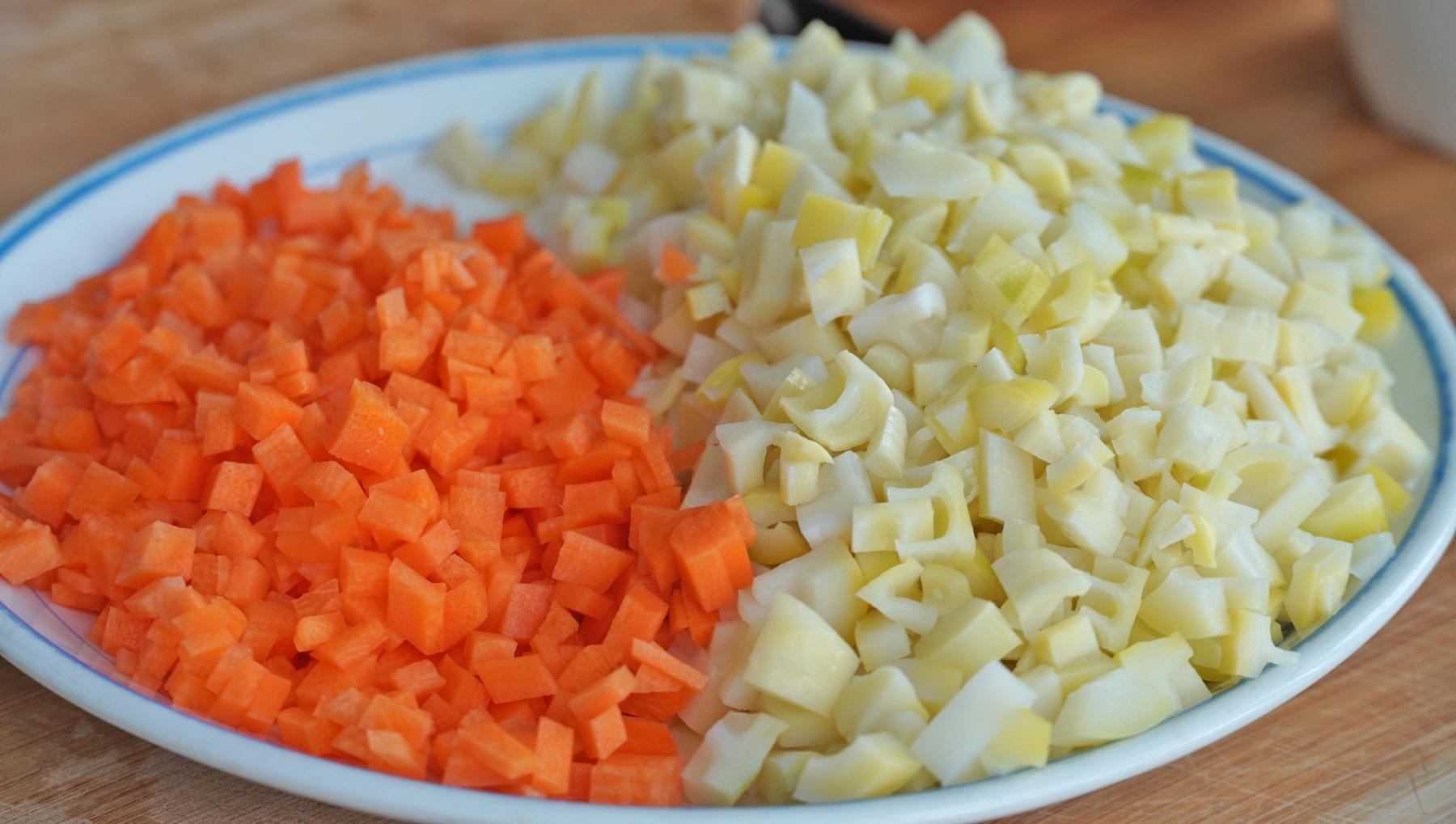 4、幹香菇加溫水泡個30分鐘,切點竹筍、胡蘿蔔,都改刀切成丁丁就可以。