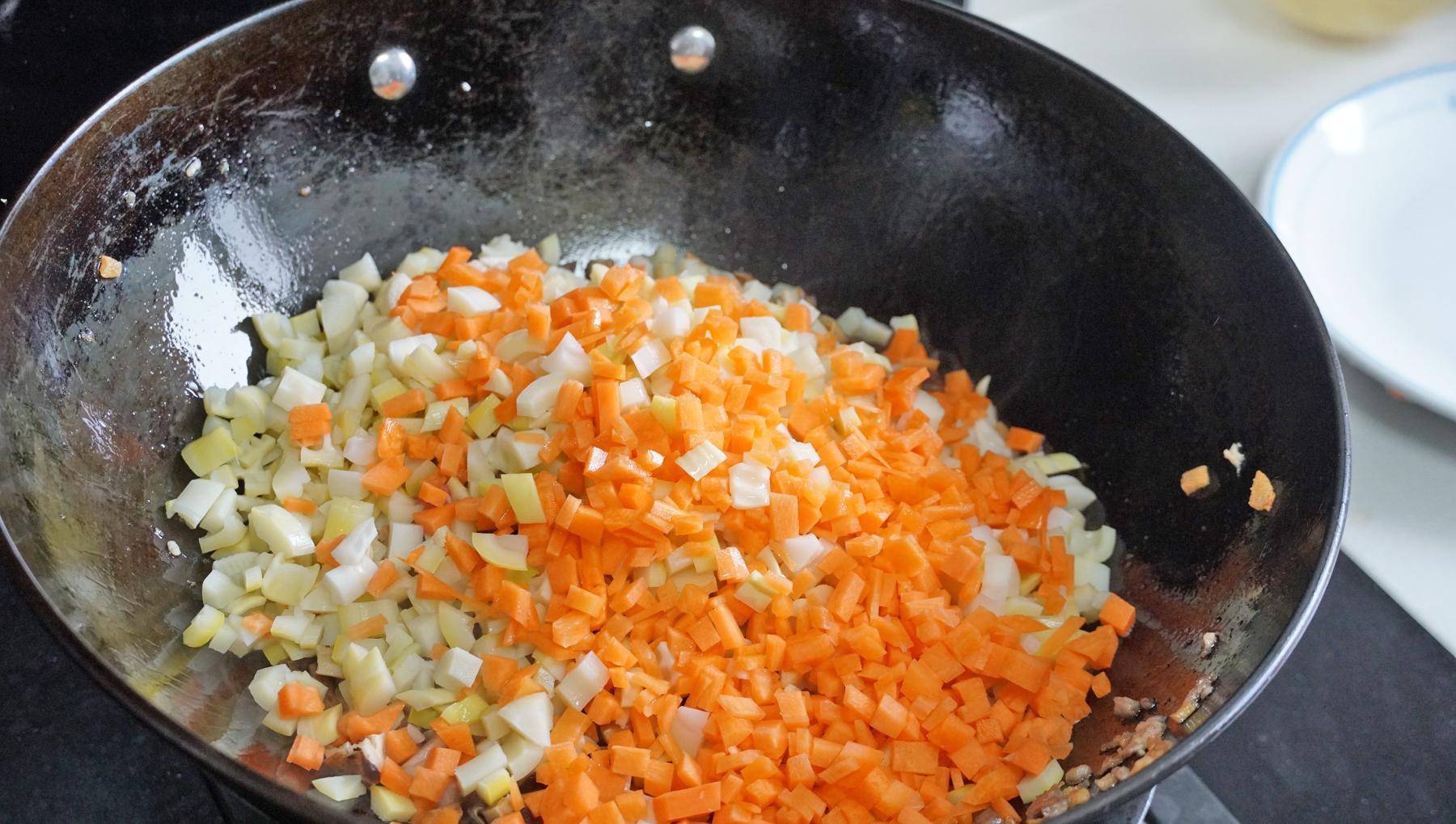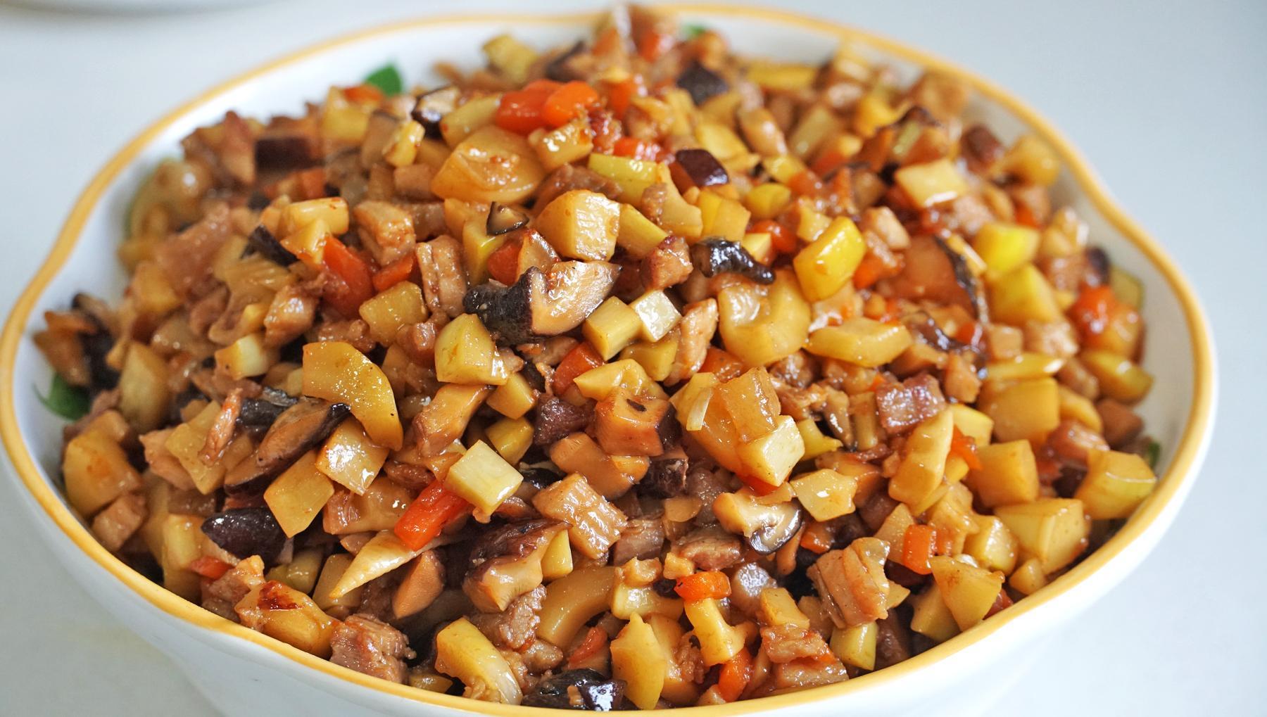 8、起鍋熱油,先下肥肉丁,炒出油脂了再下瘦肉丁,繼續翻炒。炒變色了加點蔥姜,這時候把筍子、香菇、胡蘿蔔都倒進來,大火一起炒。