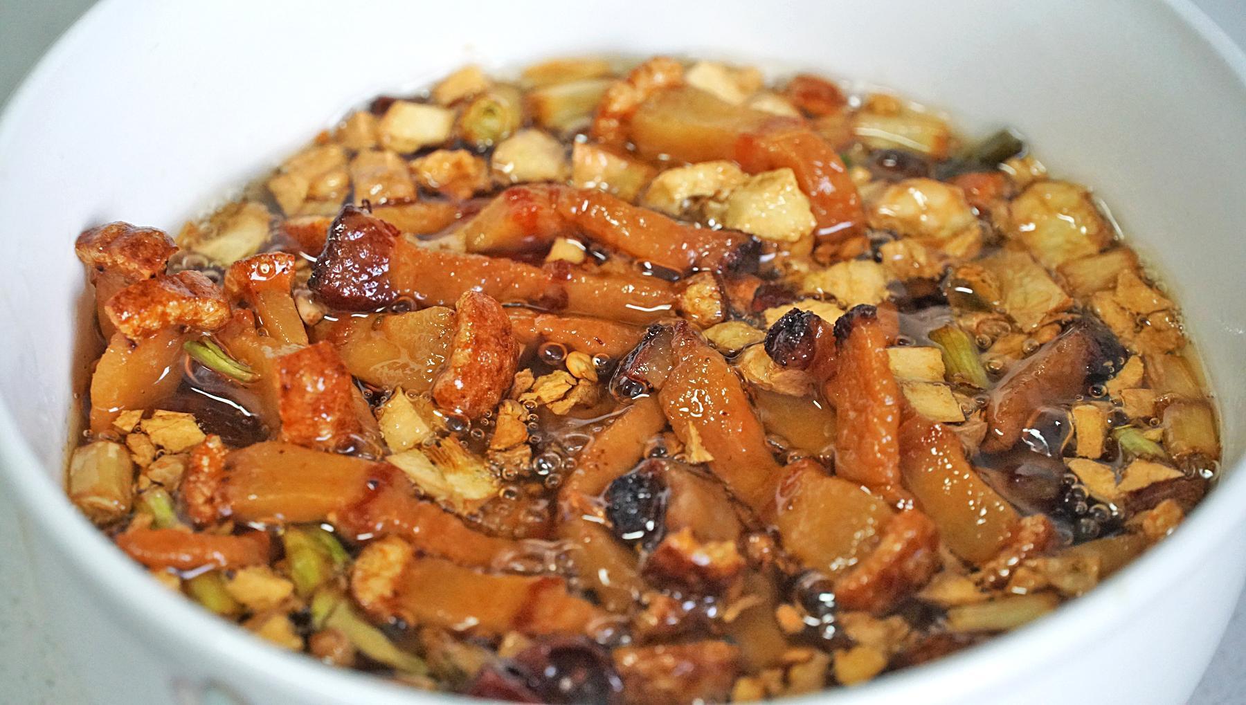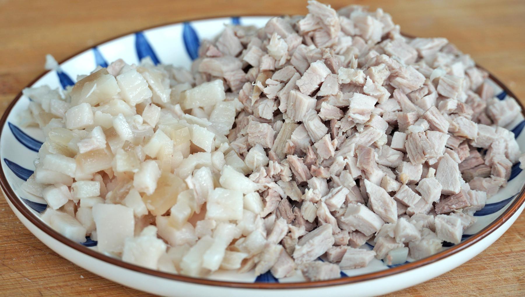 6、煮開把浮沫打一下,然後小火再煮個20分鐘,撈出來放冷了再切,肥肉和瘦肉分開切丁。