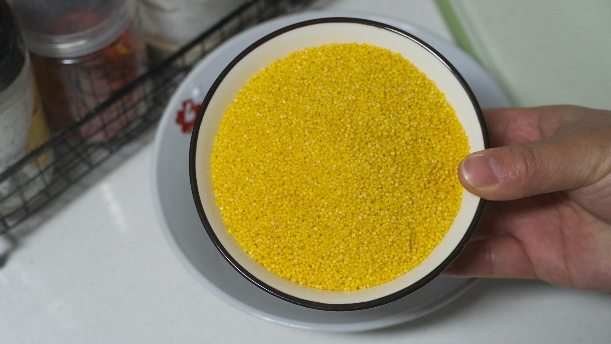 3、取出來稍微的給它放涼一會兒,然後和小米一起倒進破壁機裏面,再加30克白糖,300克牛奶。