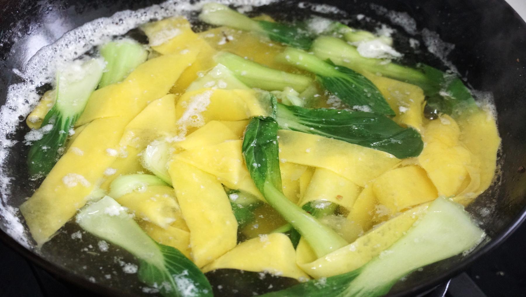 9、接着把青菜倒鍋裏頭,煮個半分鐘了就把雞蛋皮子倒進來,燙個3秒鐘就立馬撈出來,基本上就是倒進來後滾一下就要出鍋。