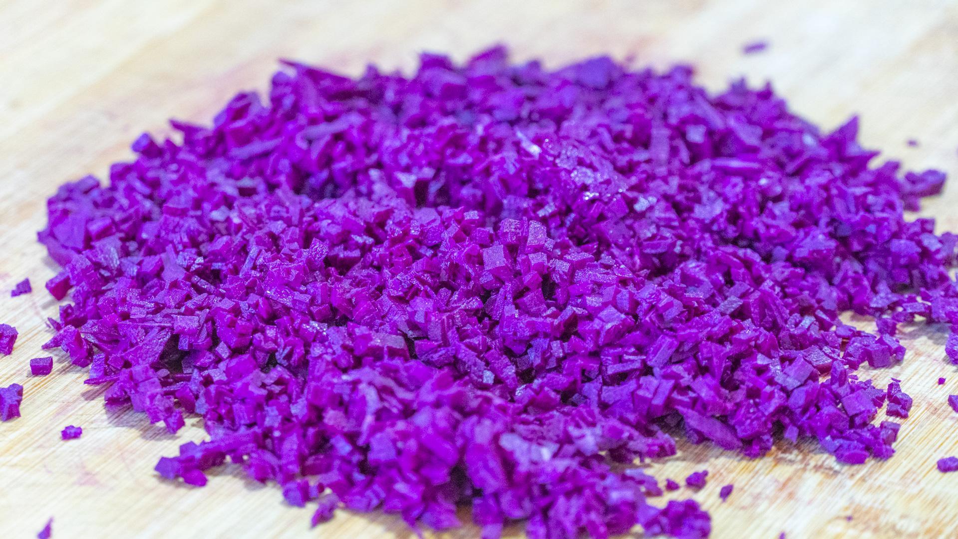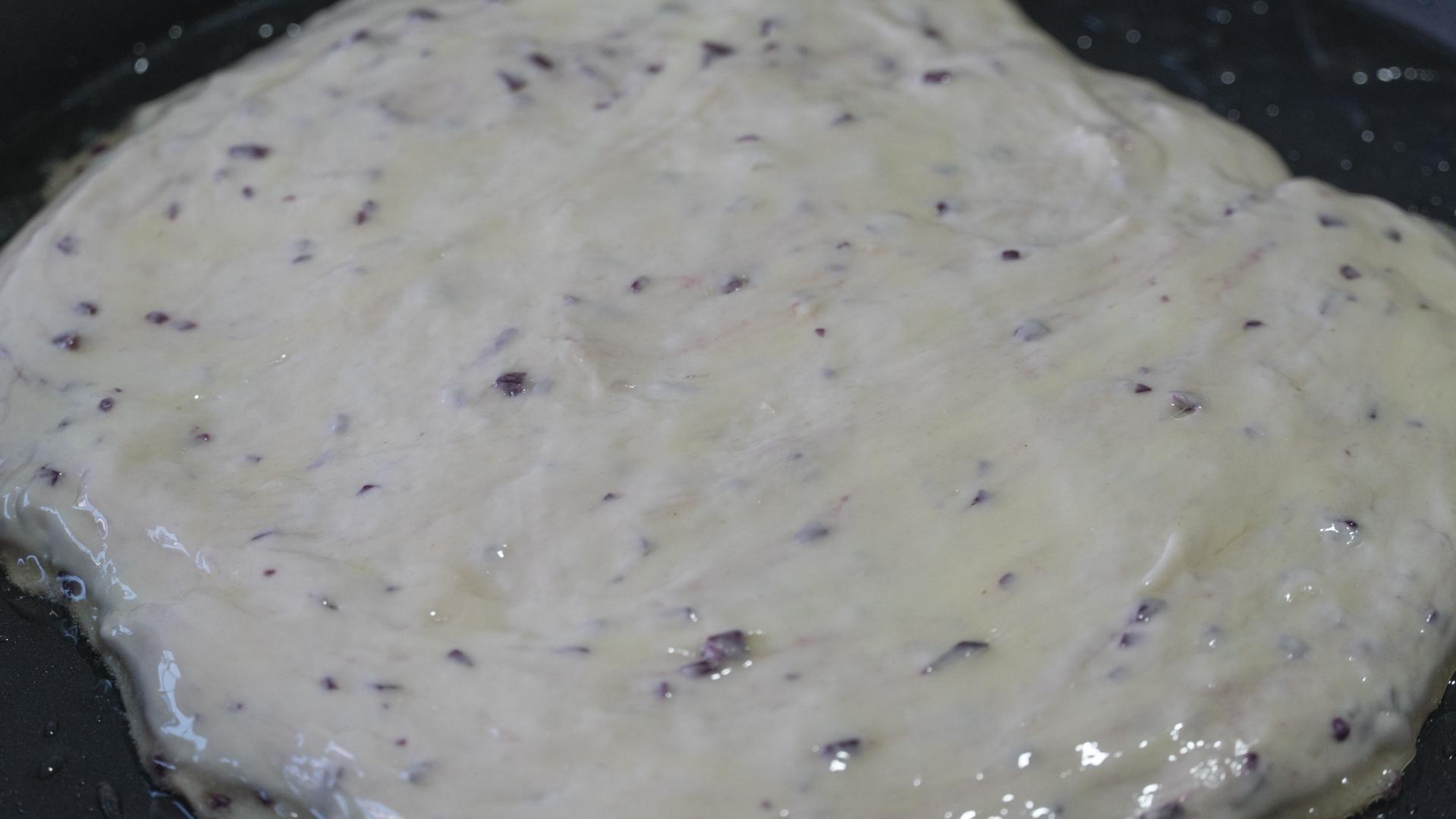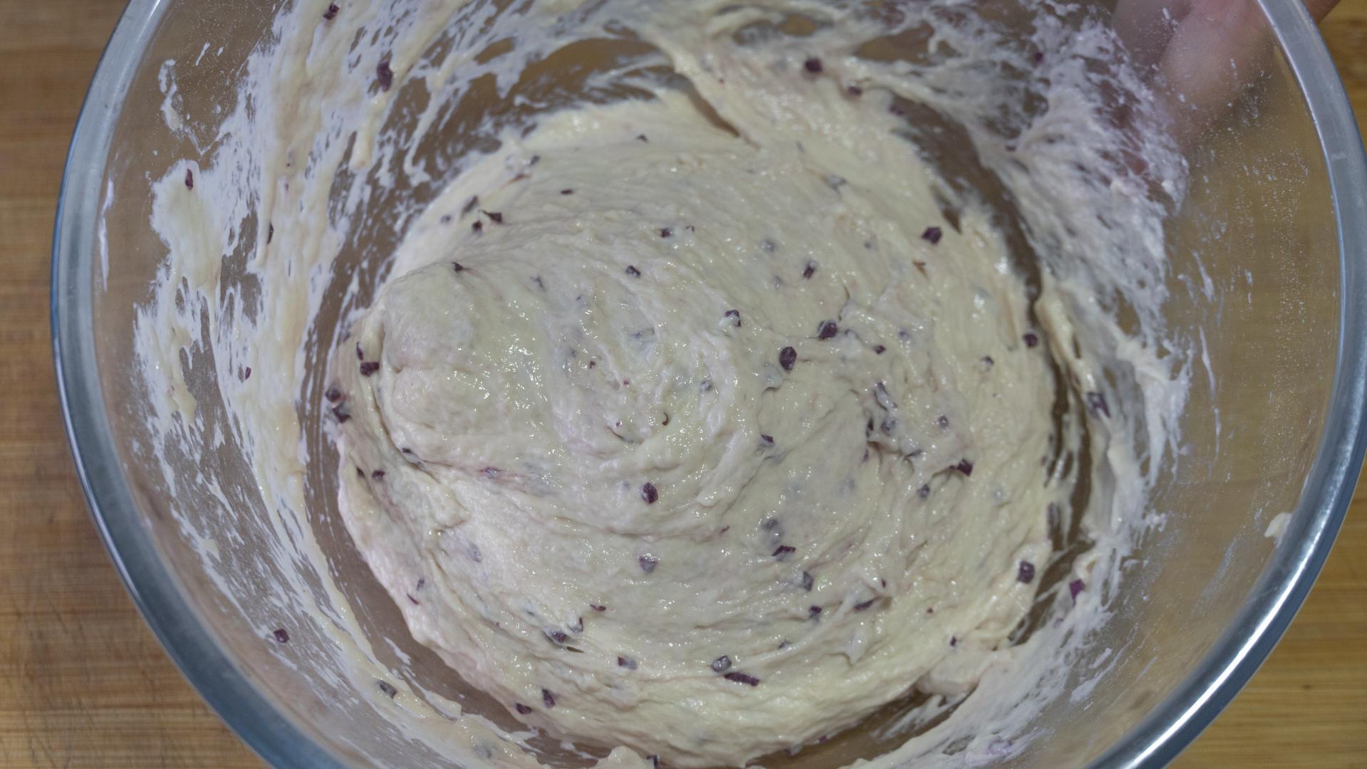 5、麪糊醒好後把切好紫薯丁倒進來,攪拌均勻就可以了。