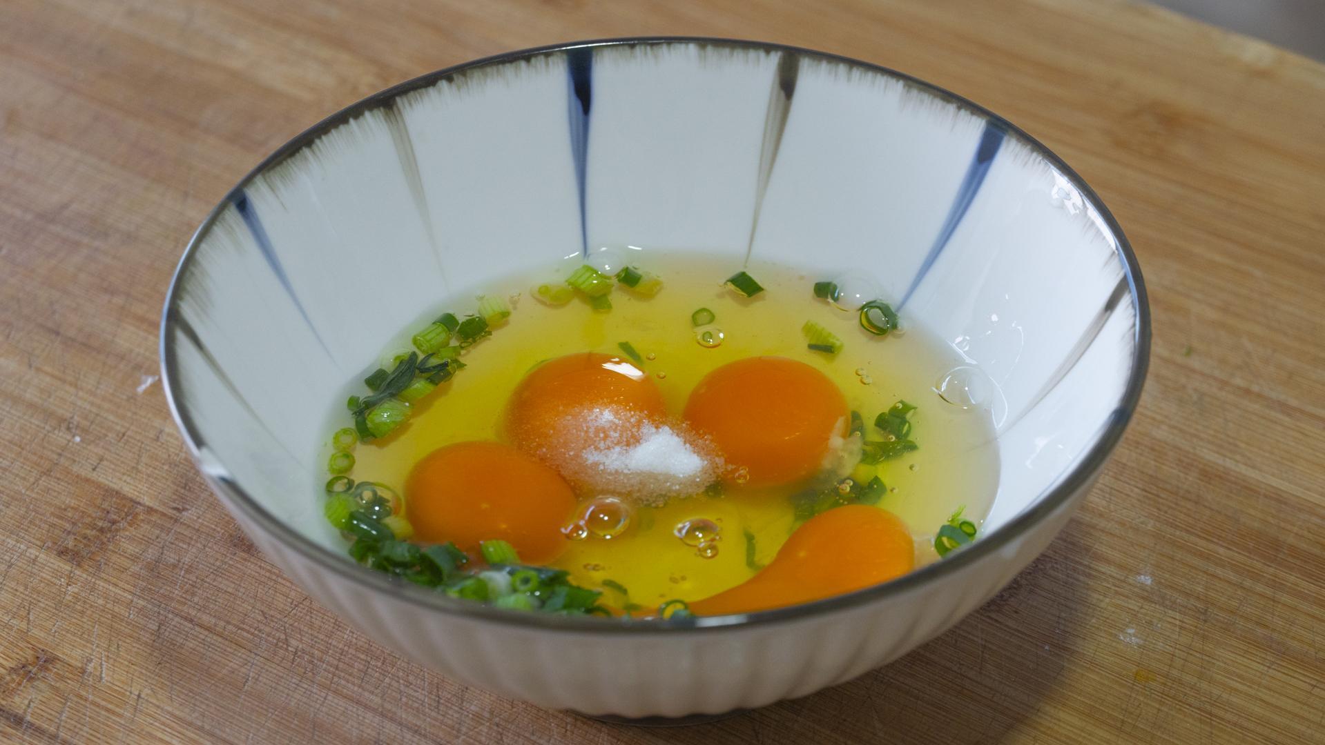 4、一把小蔥,洗淨後切蔥花,然後裝入大碗後打入四個雞蛋,加一勺鹽後攪散備用。