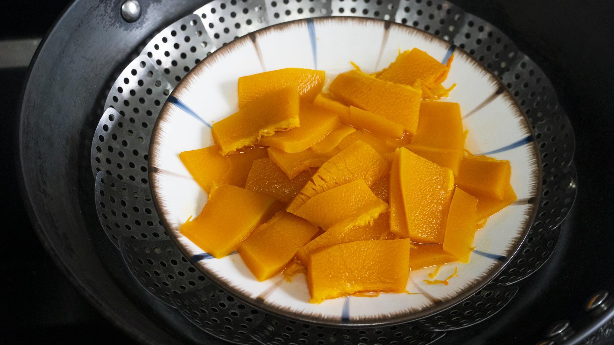 1、老南瓜一塊220克,切片上鍋蒸熟。
