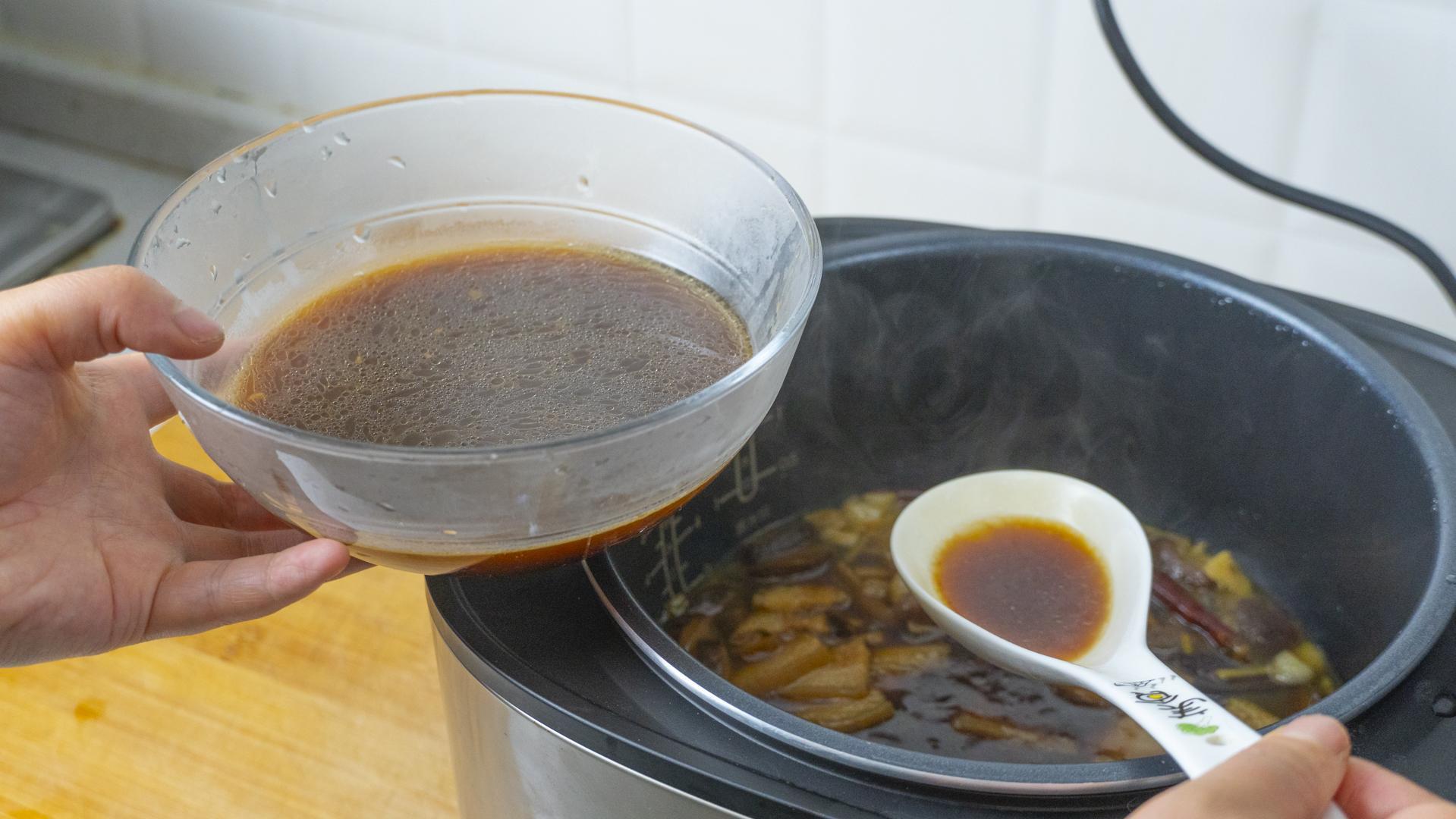 4、最後把泡香菇的水倒進來,把它們一起倒入電飯煲中,蓋上煮15分鐘。