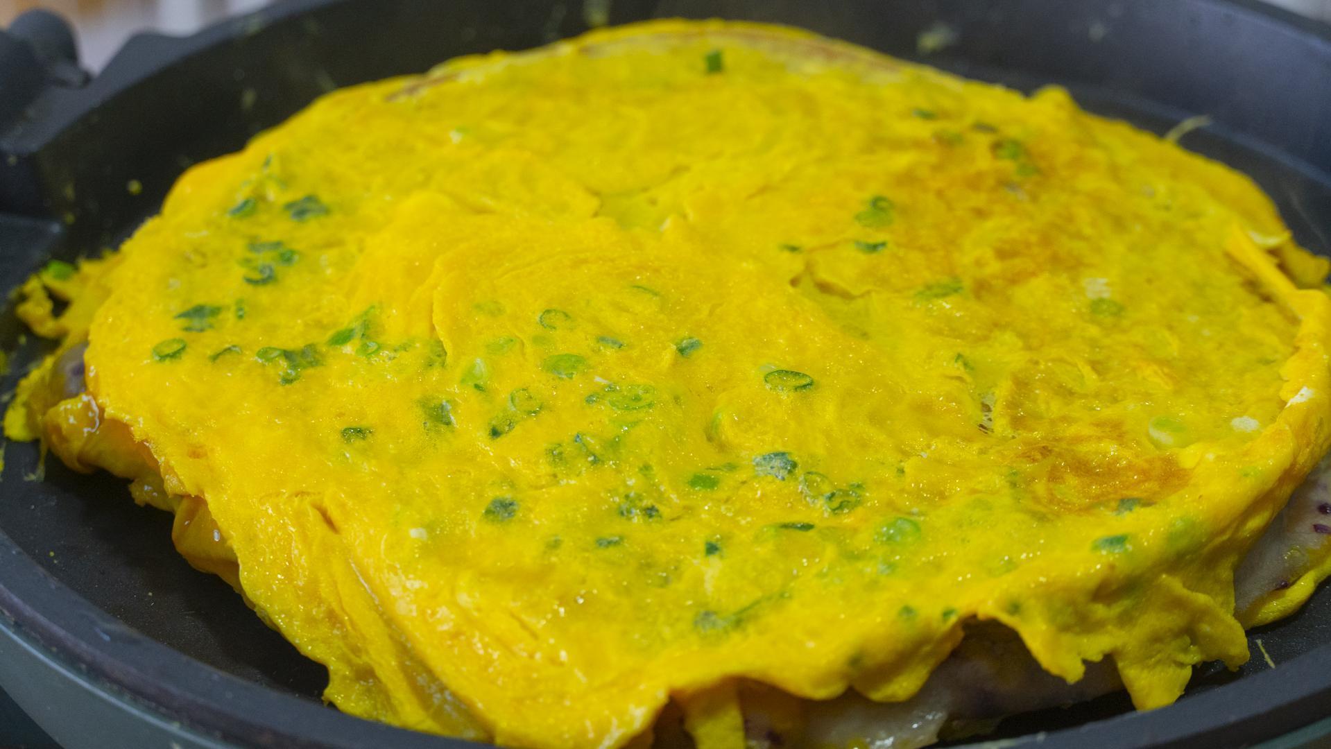 11、這時候準備2個雞蛋攪散。平底鍋刷薄薄的刷一層油,舀一大勺米漿搖晃攤勻,米漿稍微凝固就翻一個面,接着就加一半的蛋液繼續搖晃均勻。