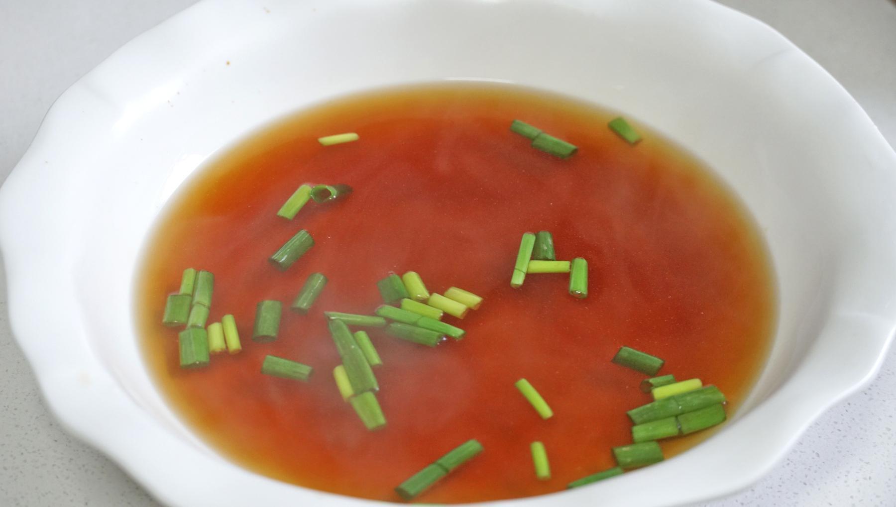 8、這下來燒水,不用洗鍋,直接加一大碗清水,先把水燒開。再來簡單調個湯底,小碗里加點鹽、雞精、味極鮮、蔥花,鍋裏水燒開了先舀2勺到碗裏面把佐料化開。
