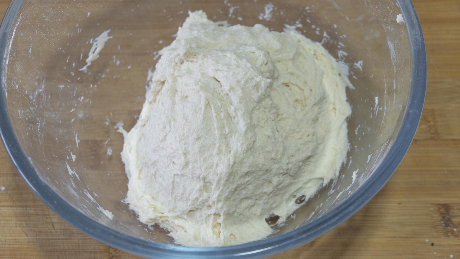 1、500克麪粉、5克鹽 、4克糖 、3克小蘇打 、8克泡打粉、 攪拌均勻後打入1個雞蛋, 250克溫水 ,用筷子攪拌成面絮狀後再加20克食用油;下手揣面,採用揣面和疊面的手法,麪糰兒基本成型後醒面10分鐘,10分鐘後繼續揣面,從邊上往中間提,同樣的步驟和手法重複三次。