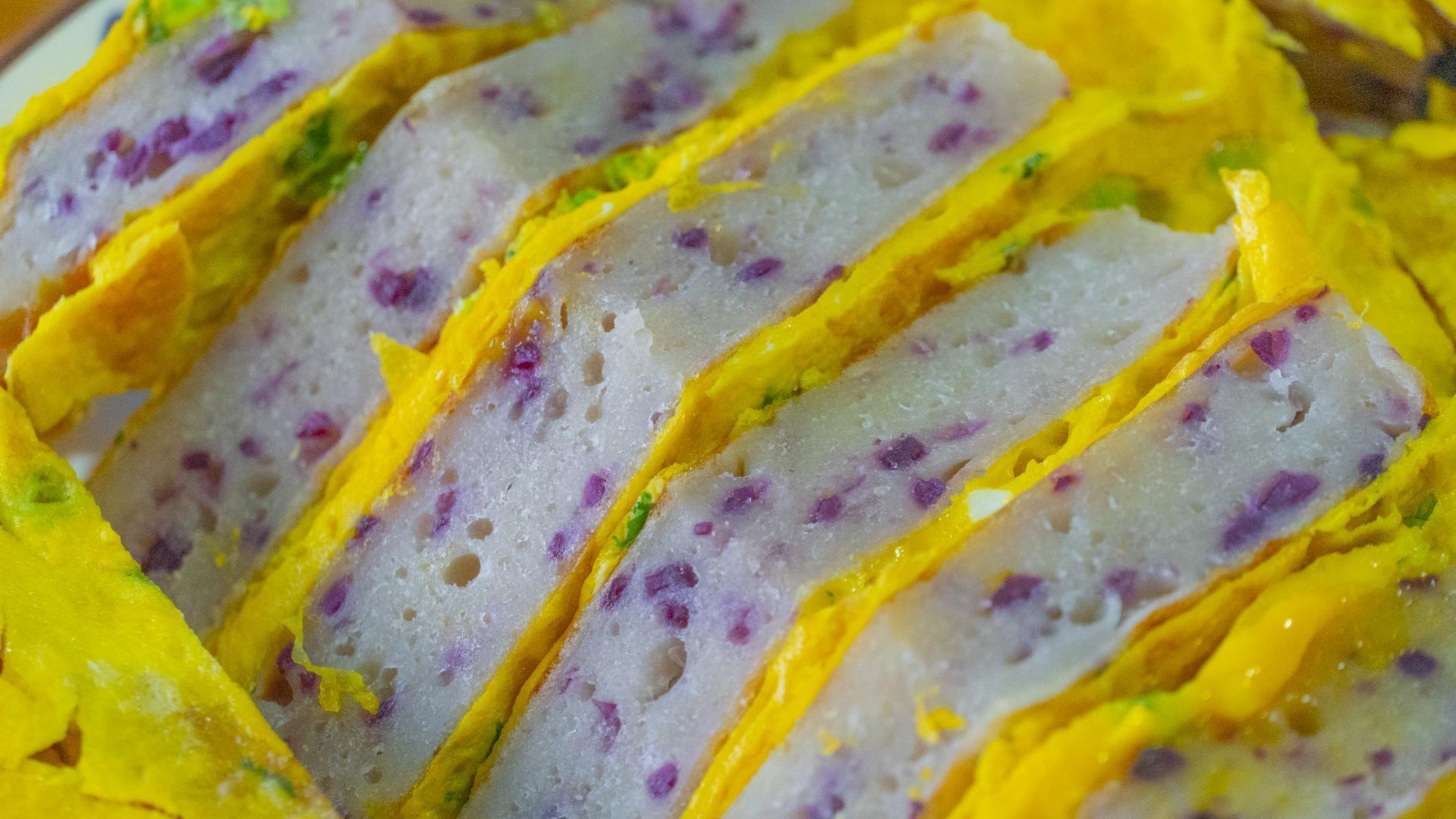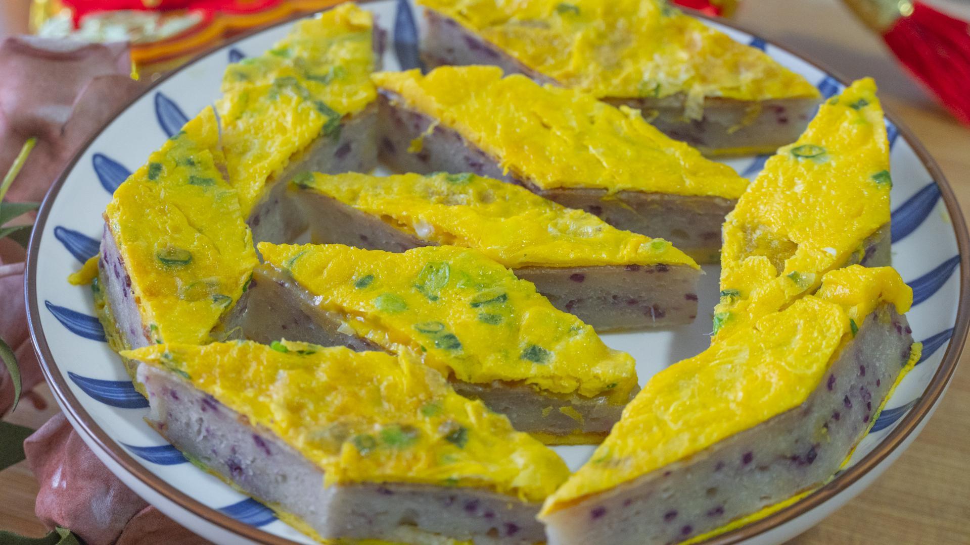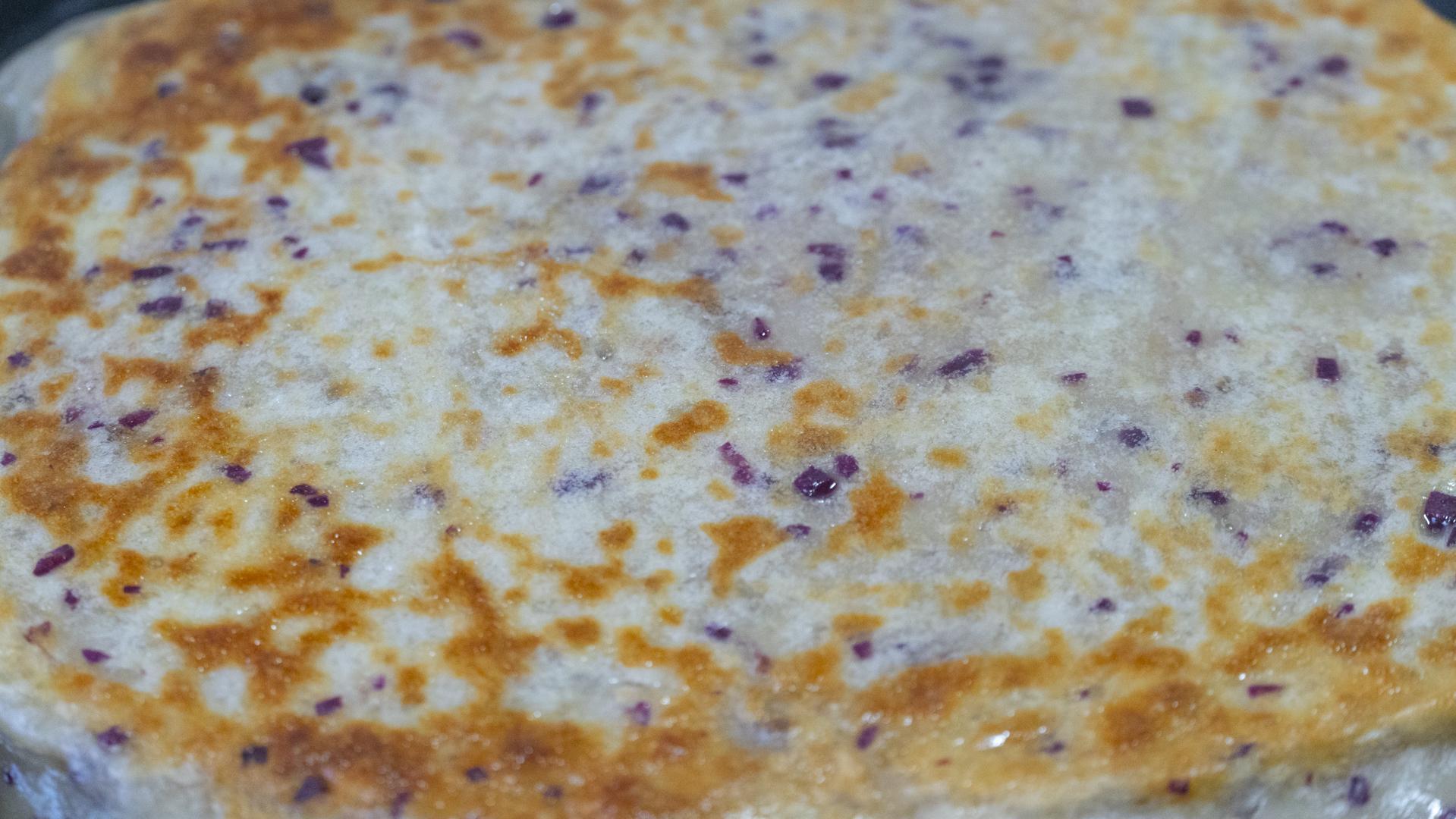 8、接着把餅取出來,往電餅鐺裏面倒入一半的蛋液,然後把餅放進去,蛋液凝固後再把餅取出來,接着往鍋裏倒入另一半的蛋液,最後再把餅放進來,等蛋液凝固後就可以出鍋了,好看又好喫的紫薯餅早餐餅就做好了。