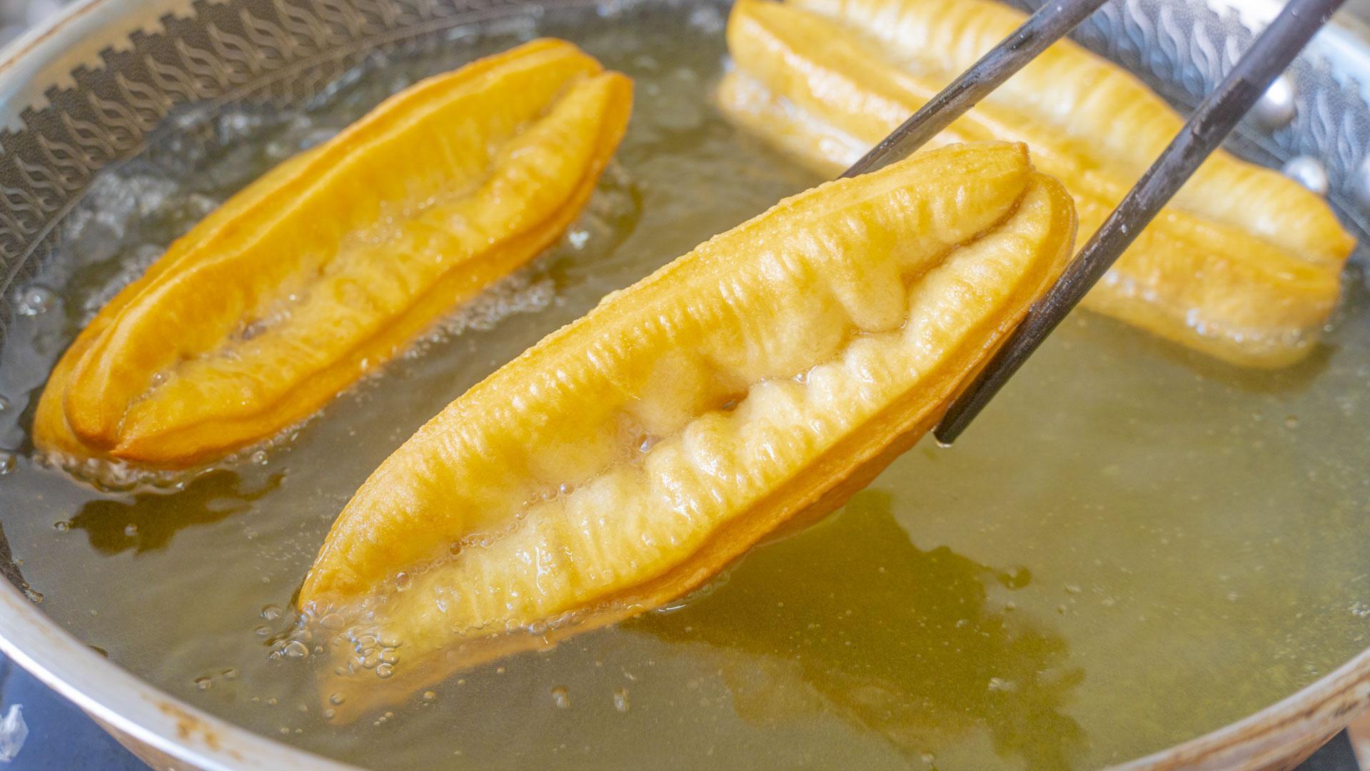 5、起鍋倒油,油溫180度下鍋炸下鍋前稍微的抻長一點,油條飄起來後用筷子不停的翻動油條,這時候油條會迅速的膨脹變大,直到炸至油條金黃熟透就可以出鍋了。