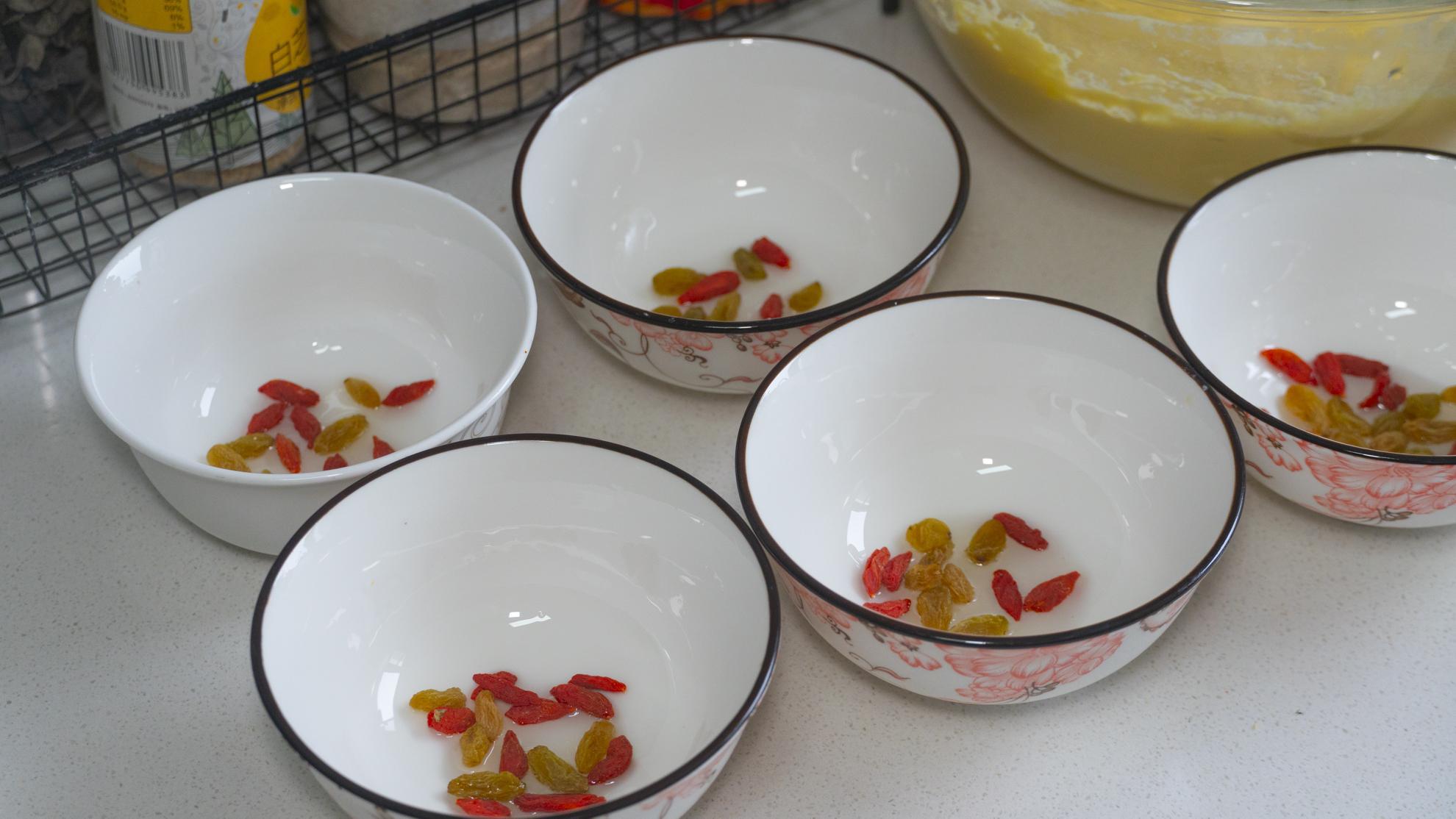 5、攪拌一下,給它排排氣,這一步是不能少的,不然蒸出來就很容易塌陷的。小碗裏面給它刷點油,碗底下可以先加點自己喜歡喫的果乾。