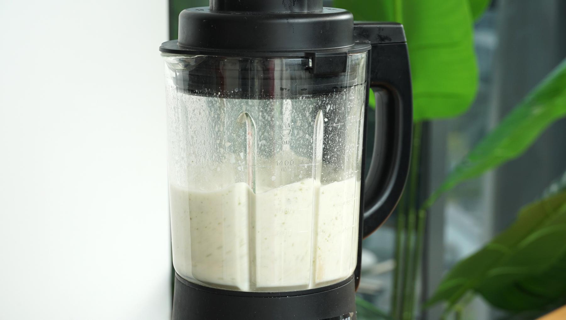 3、大米和豆子先把水瀝乾,倒入破壁機里加適量清水打成細膩的粉漿,倒出來加一勺鹽拌勻。