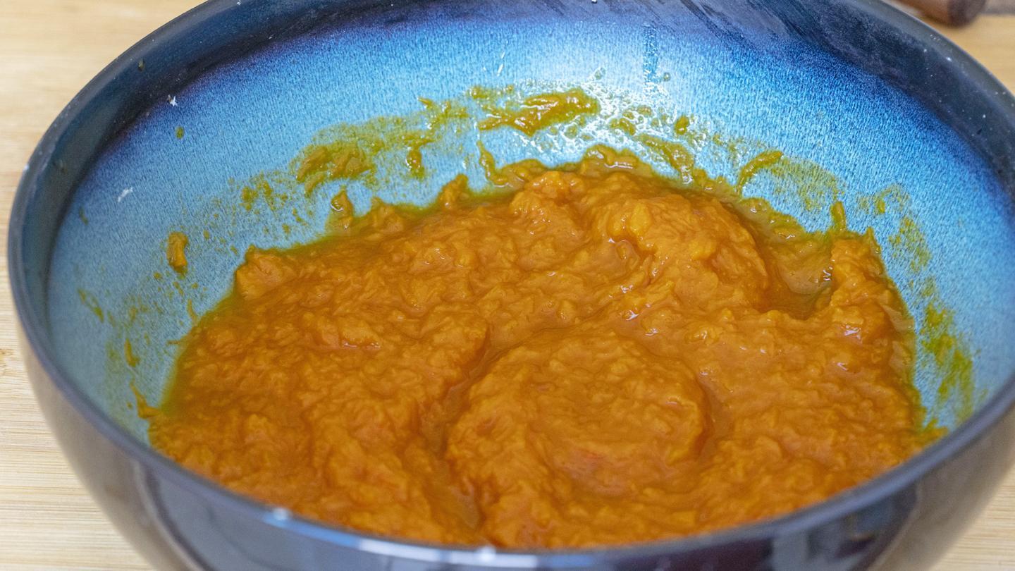 3、南瓜蒸熟了,趁熱加10克白糖搗成細膩的南瓜泥,放涼後加300克麪粉,3克酵母,10克白糖。