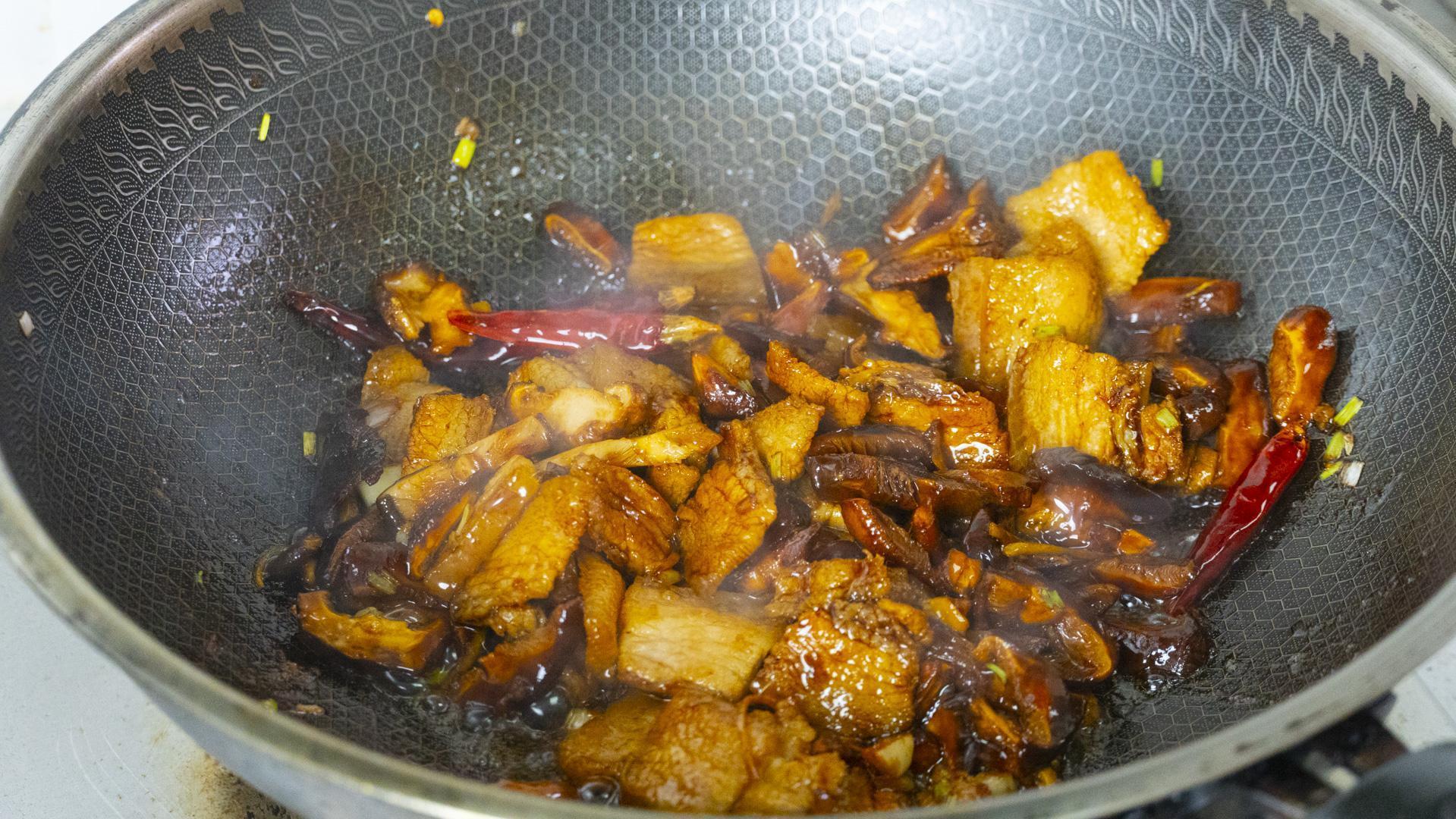 3、起鍋熱油,倒入五花肉,先煸炒出油脂,加2個八角,2個幹辣椒增香提味,五花肉炒至有點微焦後倒入蔥薑蒜,再把香菇倒進來一起炒。調味加生抽,老抽,蠔油,雞精,白糖,十三香,鹽,先把肉炒上色,然後再沿着鍋邊淋入一勺料酒去腥。