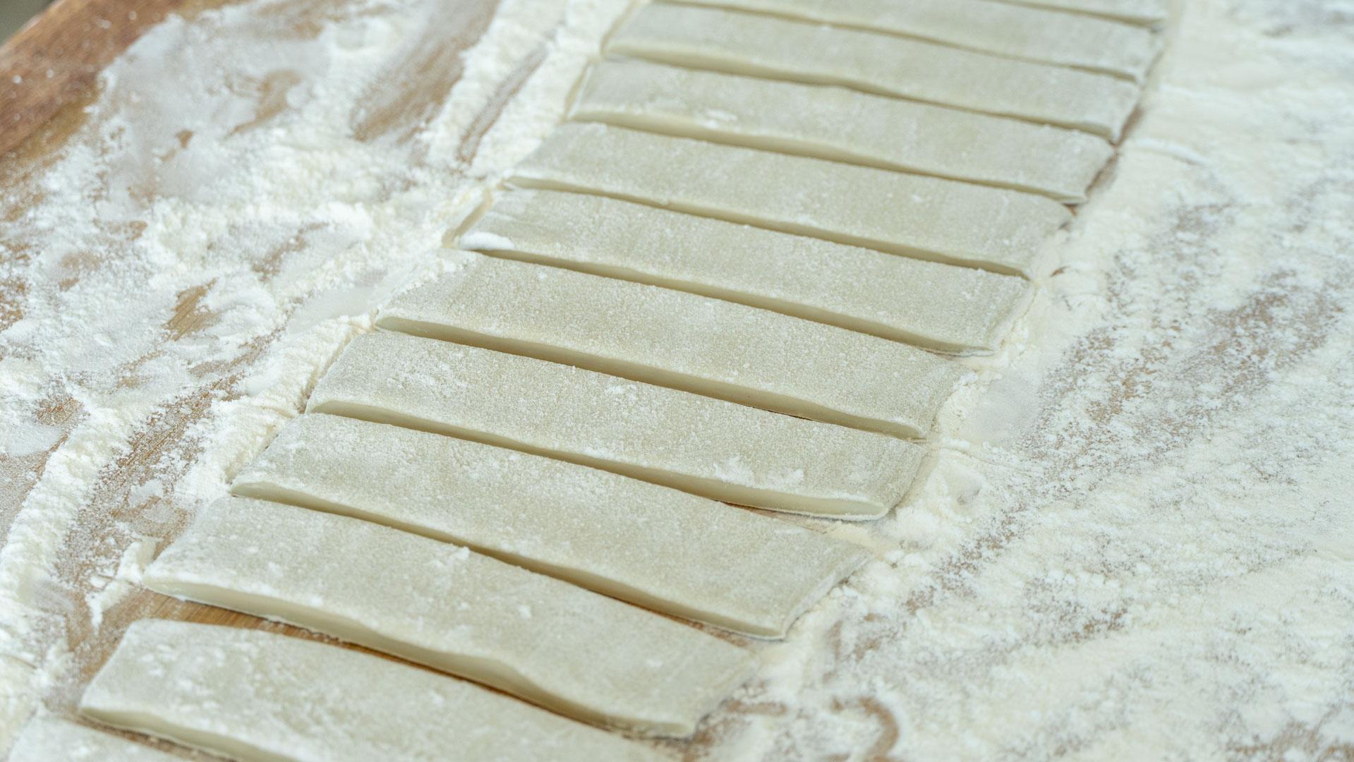 4、切成寬2釐米左右的長條,然後用筷子沾水後打水線,兩張一重疊,全部做好後用刀背壓一下,避免炸的時候散開,最後去掉兩端整理一下形狀,我們的油條生胚就做好了。