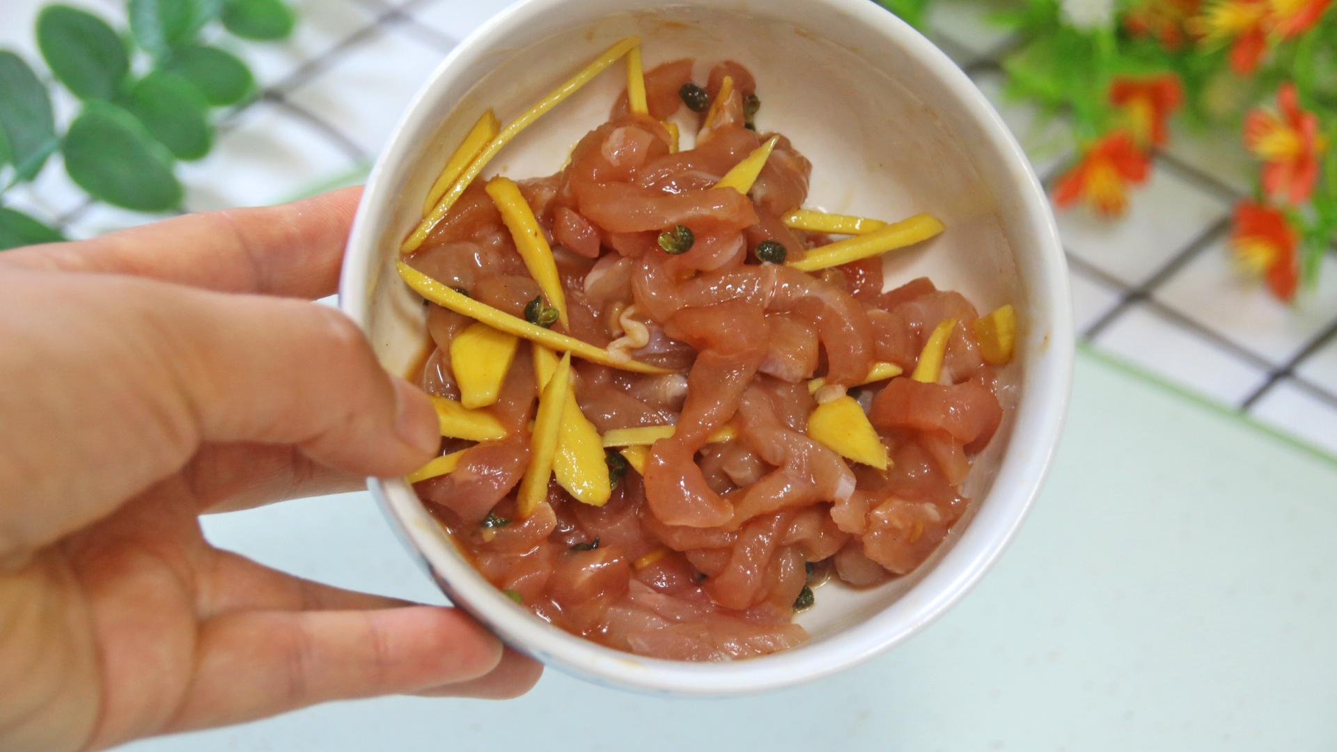 3、提前切了一點肉絲:加薑絲、花椒、料酒、醬油、蠔油、澱粉抓拌醃製一下;