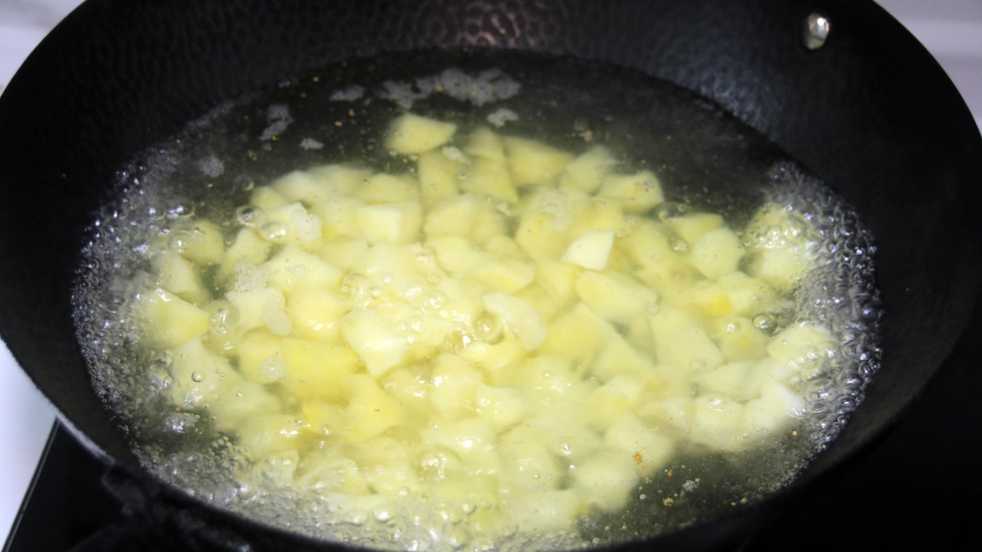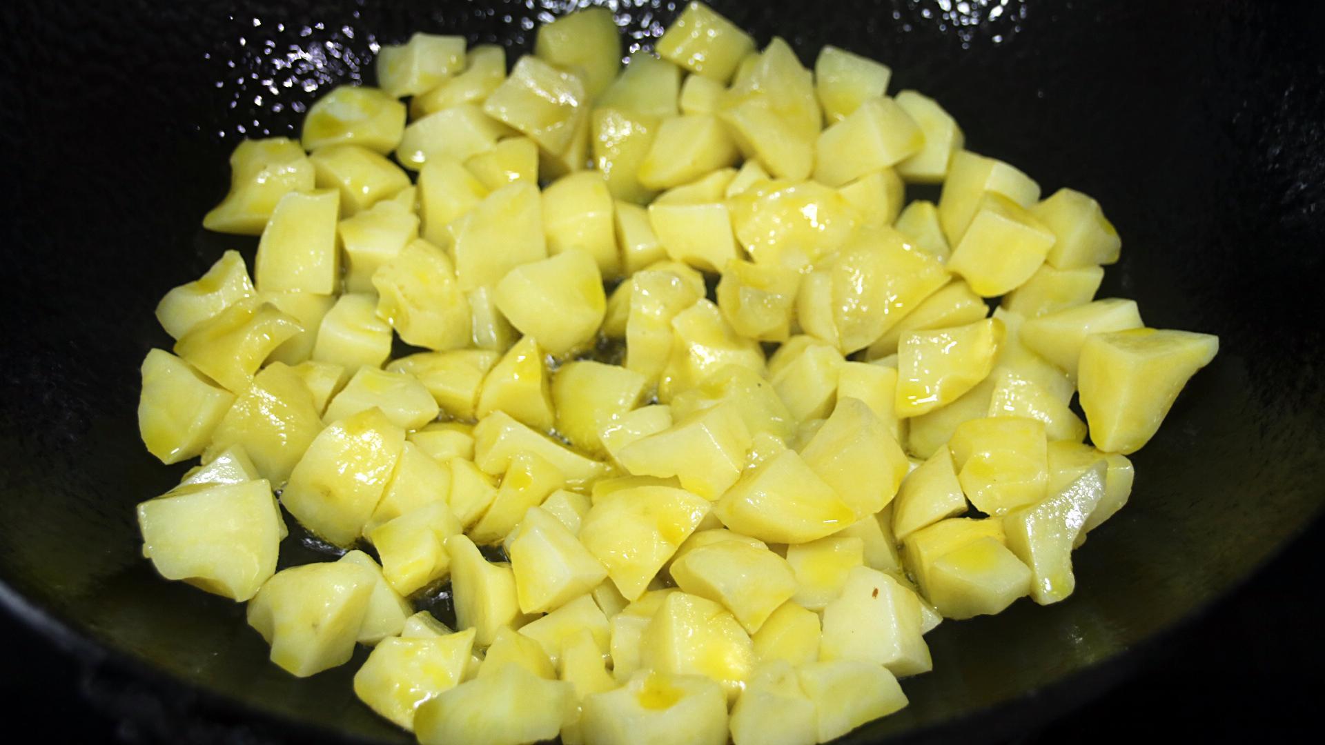 3、油熱倒入土豆丁煎至表面金黃出鍋;