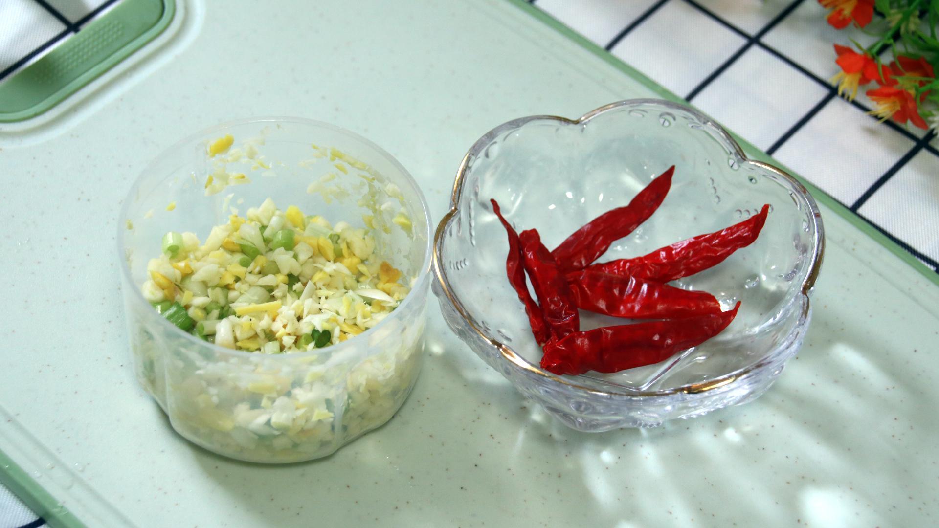 4、準備一點蔥薑蒜末做小料爆香鍋底,準備少許的幹辣椒提味增色;