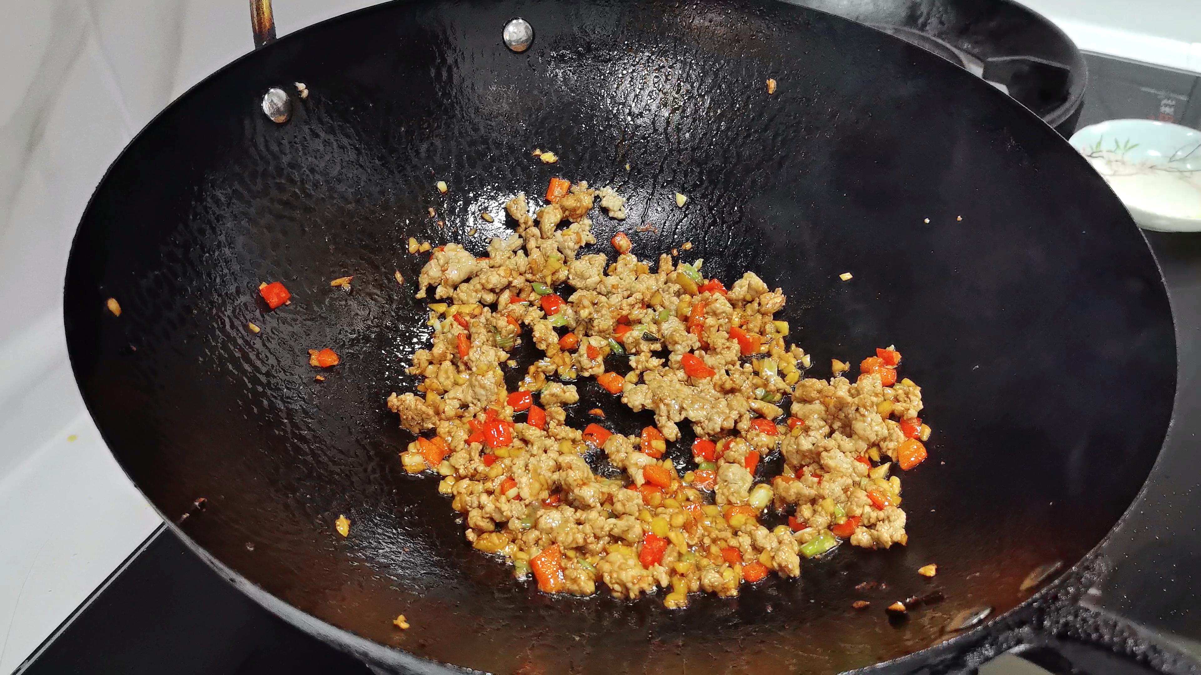 4、鍋中留底油加蔥薑蒜紅椒丁炒香,下肉沫炒熟炒散,加料酒、少許老抽炒至上色