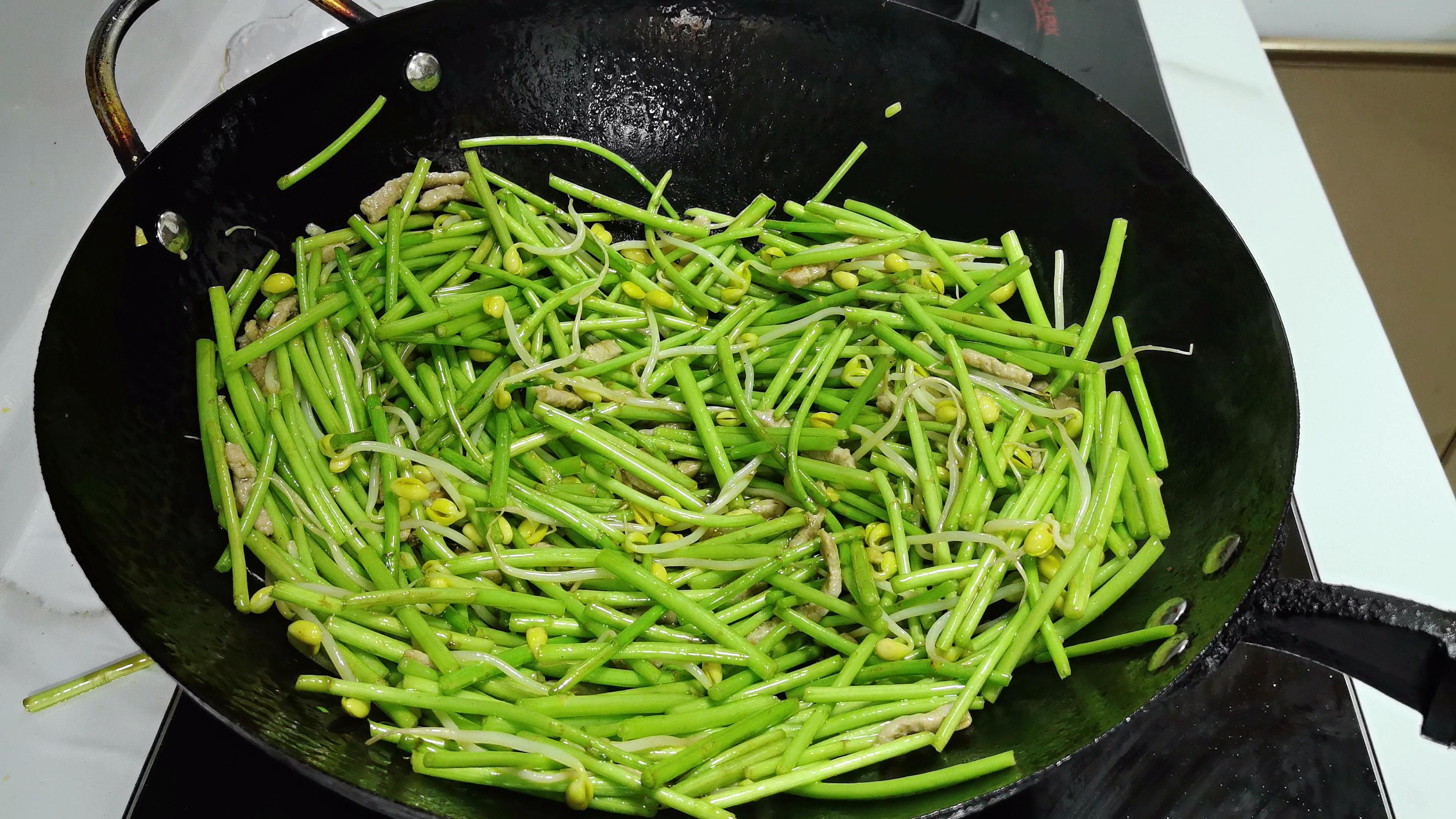 5、鍋裏燒油,油熱後加入肉絲滑散,接着加入蔥蒜末炒出香味,再將蘆蒿和黃豆芽一塊下鍋,保持大火翻炒個30秒左右,加鹽提前幫助蘆蒿入味;