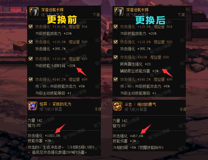 【核心思路】把深潛褲子的“lv75技能-20%冷卻”換成“20全屬強或lv80技能+1”,同時把首飾部位的“怪異/監視者貼膜”換成“鬥志貼膜”!