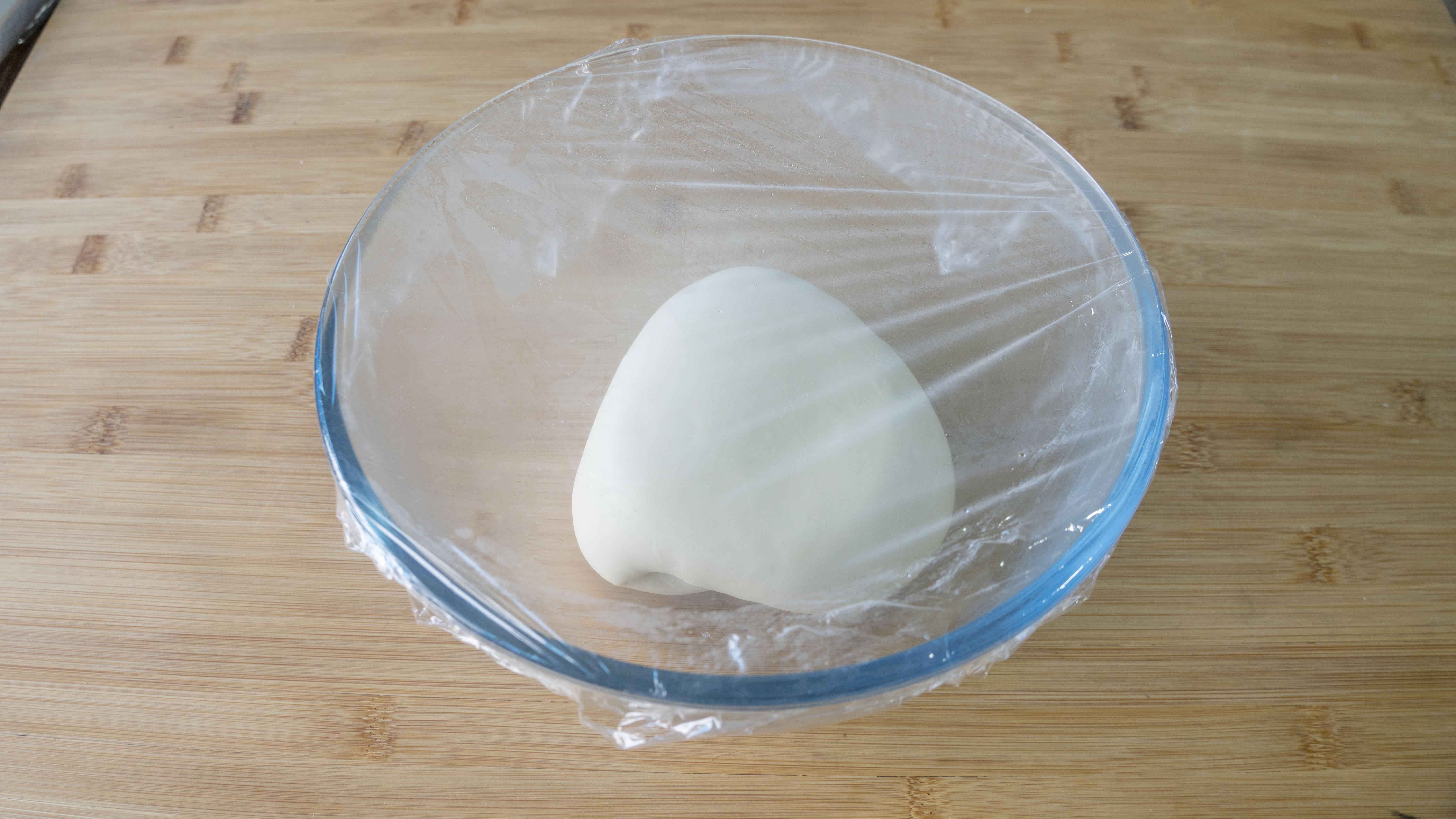 5、現在來做餃子皮部分:中筋粉350克、水120克,揉成一個麪糰兒後先蓋上醒面20分鐘;再來揉麪你會發現很容易揉光滑,繼續醒面1個小時;