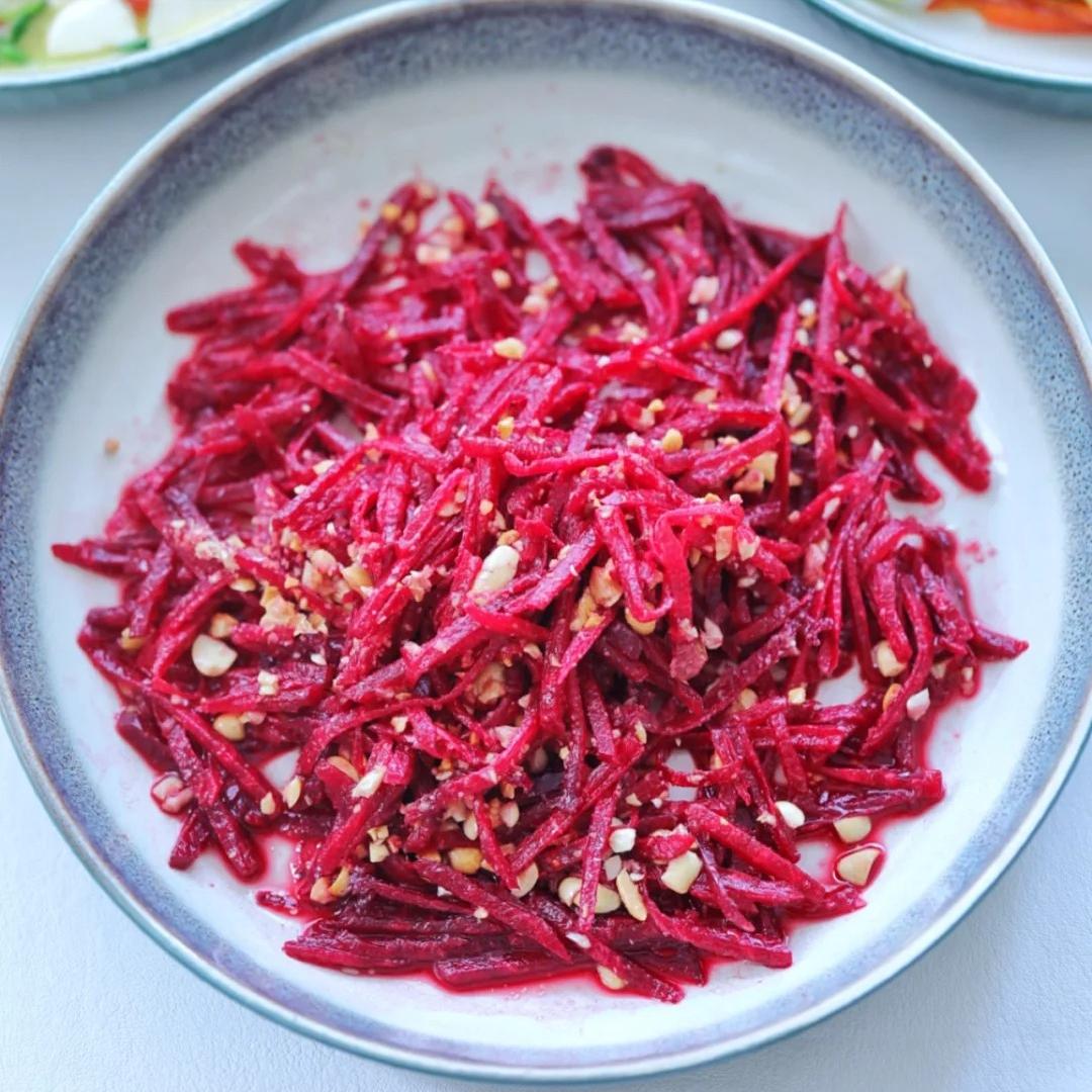 4️、油醋汁和花生碎放入甜菜根裏攪拌均勻就好了。想要好喫,油潑汁很重要,花生碎是靈魂,每一口甜菜絲裹着花生碎拌着香汁,爽口醇香,哪兒還有什麼土腥味兒,一個人喫一盤都不夠。