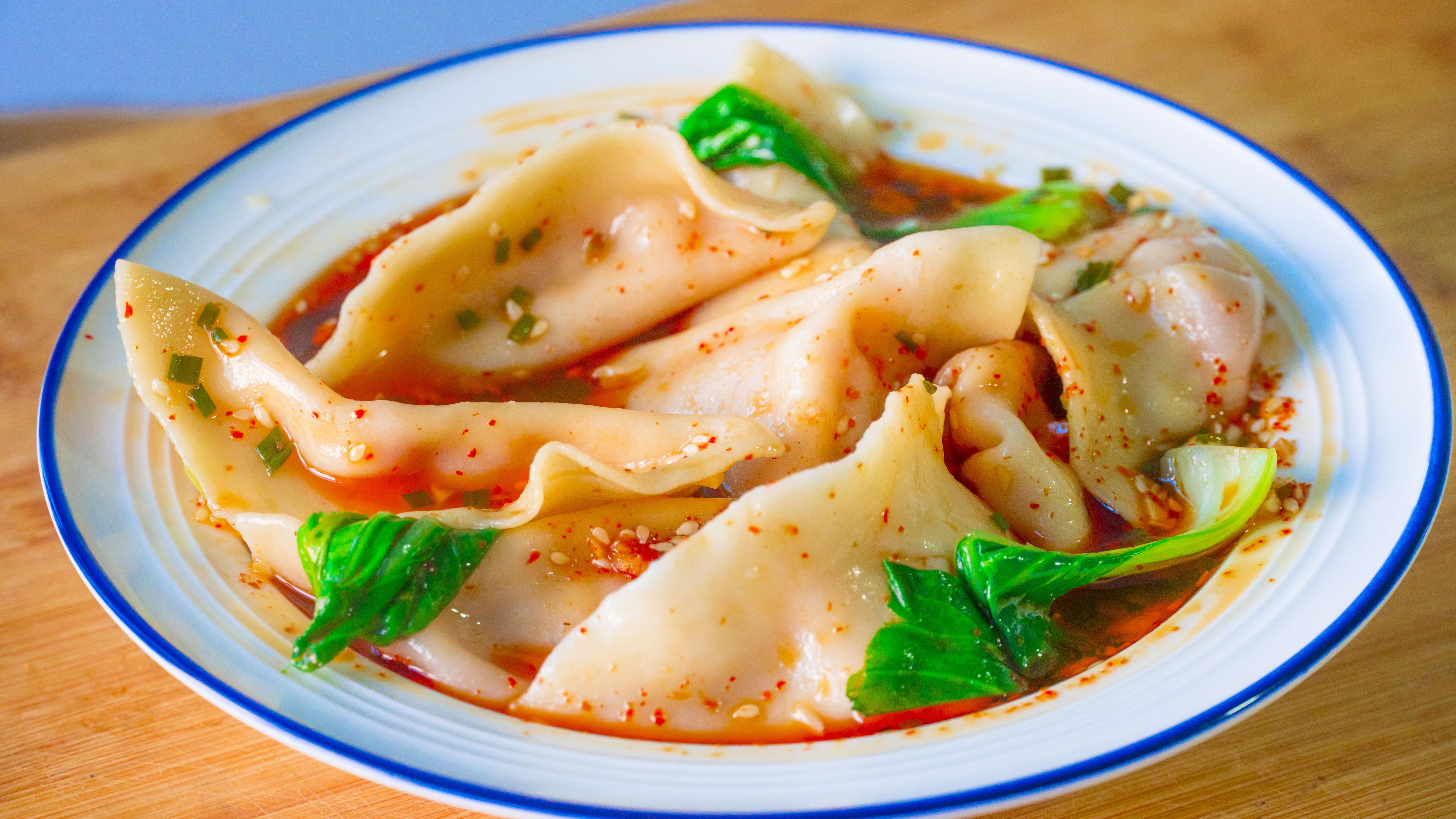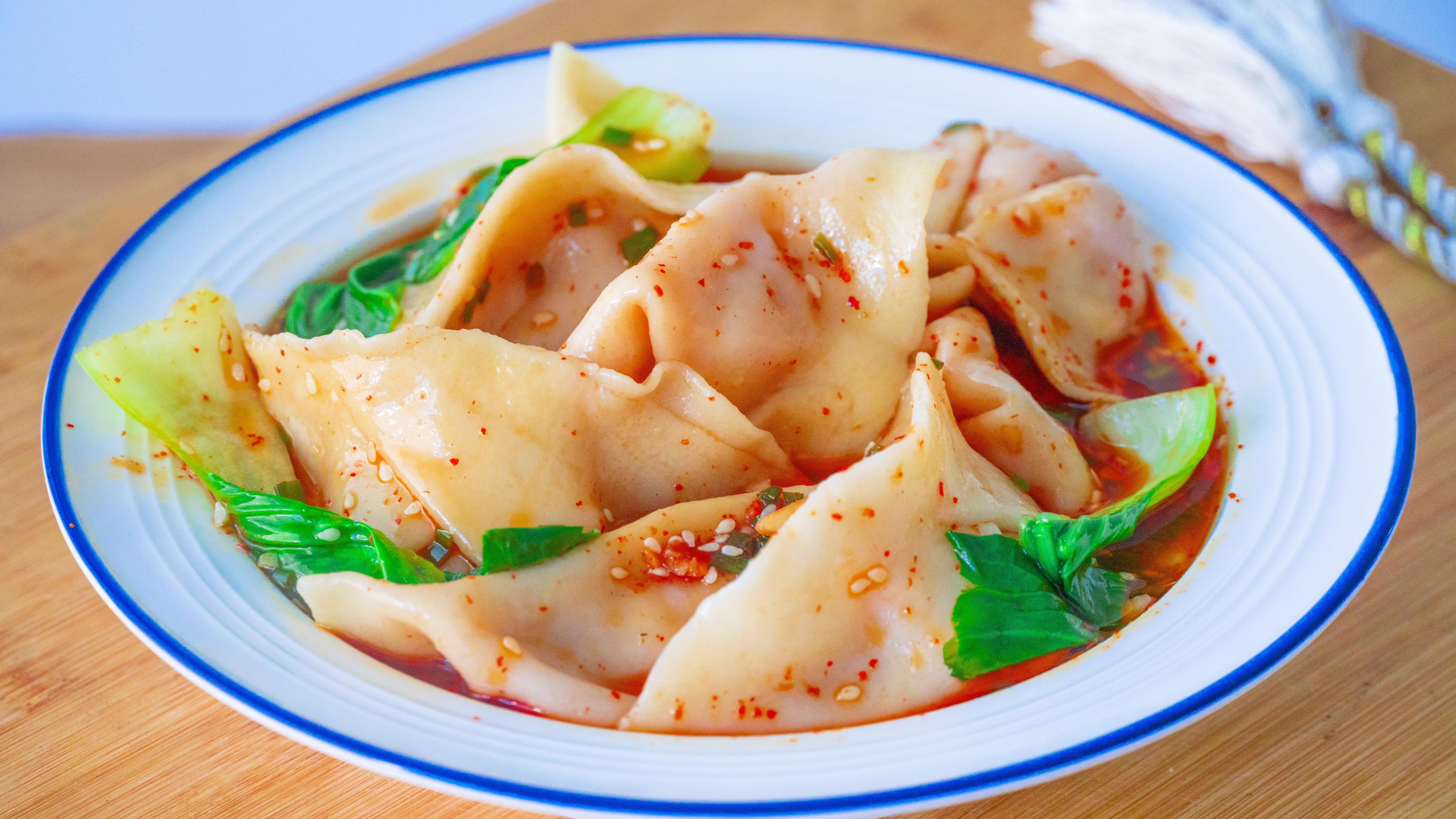 10、澆上調好的料汁,熱騰騰的餃子湯,再來點青菜,解饞開胃的酸湯水餃就可以開喫了;