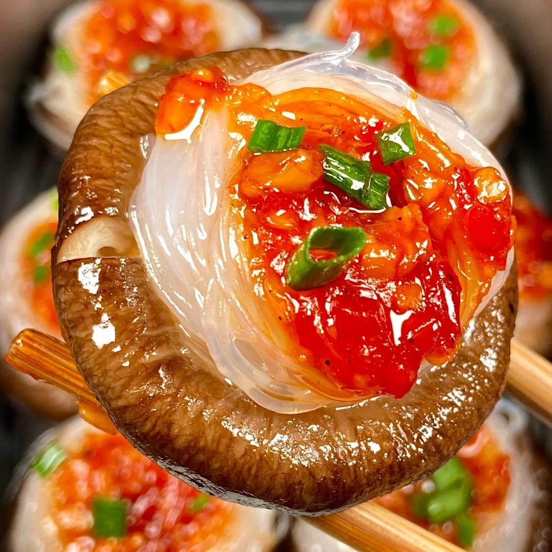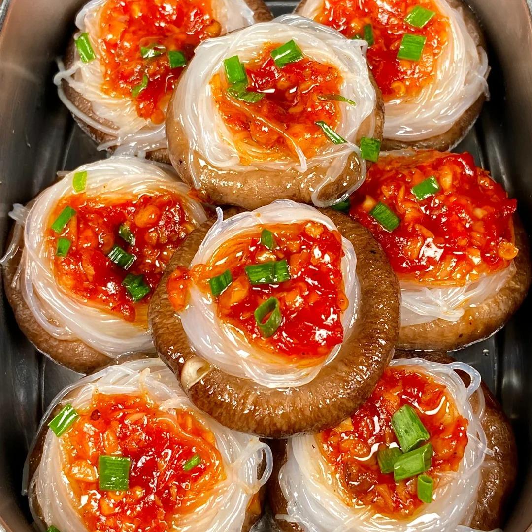 4、粉絲我用了一個龍口粉絲,加水泡軟了一點,然後每個香菇上都放上一圈粉絲,舀一勺蒜蓉醬,上鍋蒸個8分鐘就可以了;