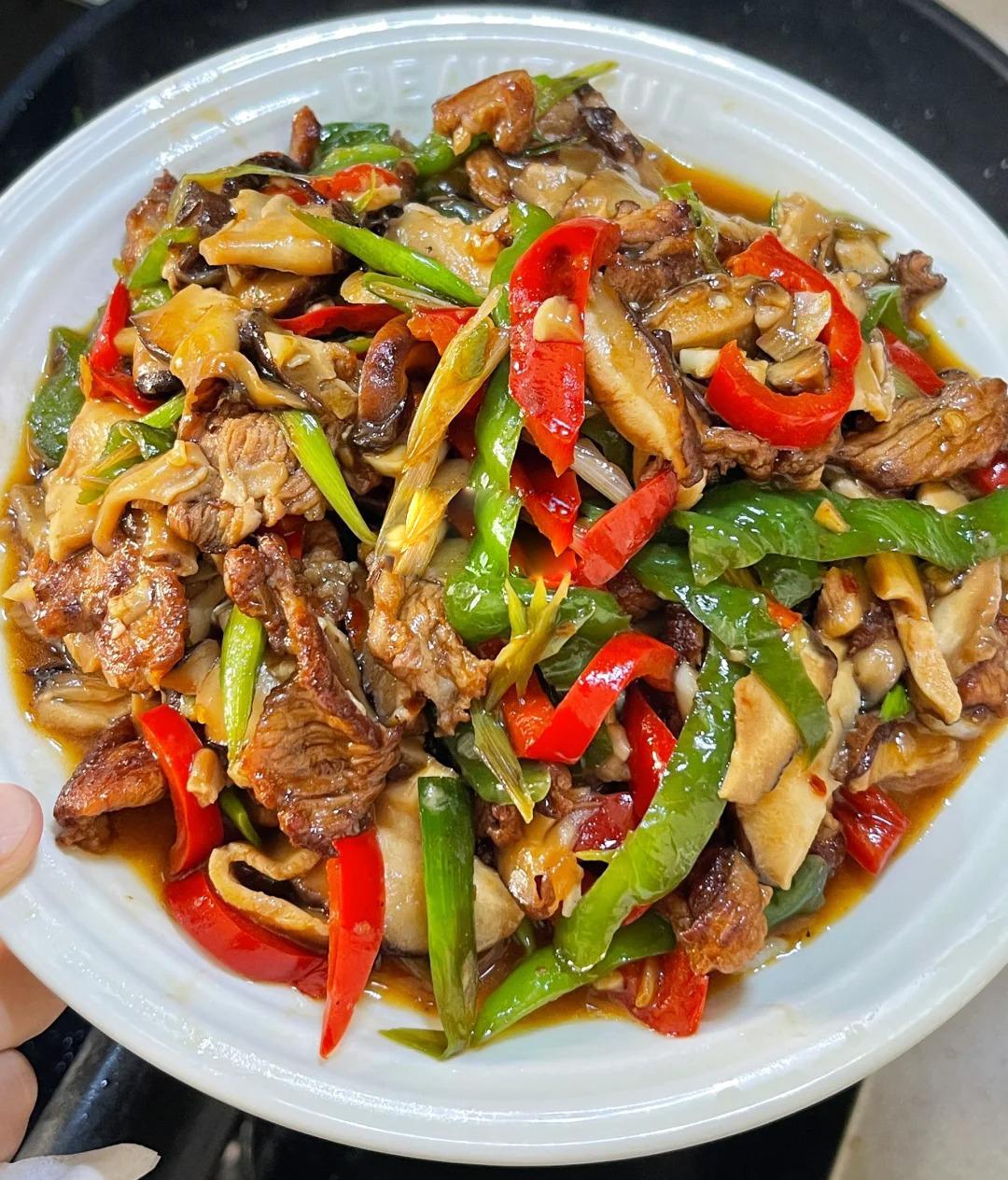 3、油熱了加點蔥薑蒜花椒小米椒爆香,先把肉絲炒一炒,變色了加點鹽、生抽、蠔油、胡椒粉,炒勻了把香菇和青椒都加進來,
