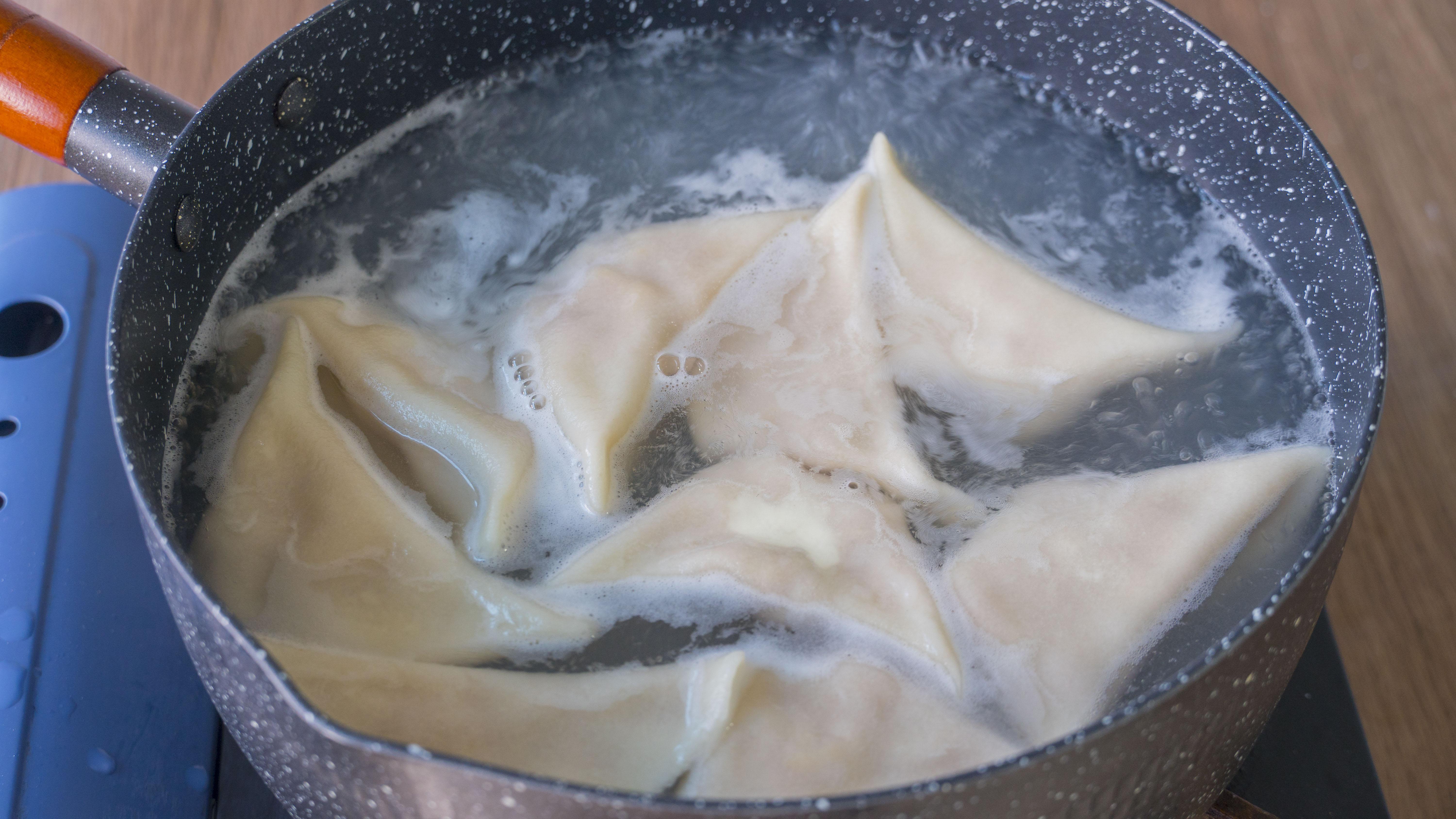 9、水開了,加一勺鹽下餃子,用鍋鏟輕輕的推動一下鍋底避免粘鍋,水開後加少許涼水一共重複三次。